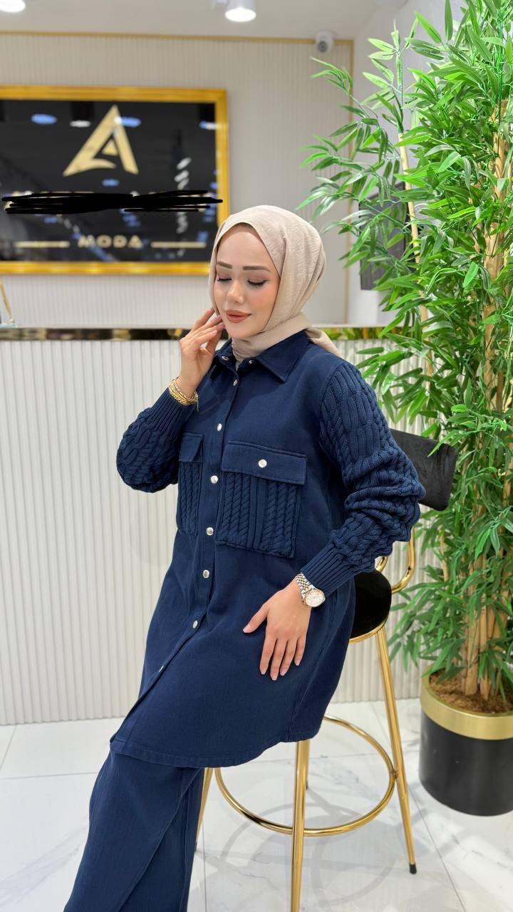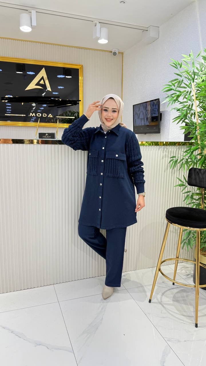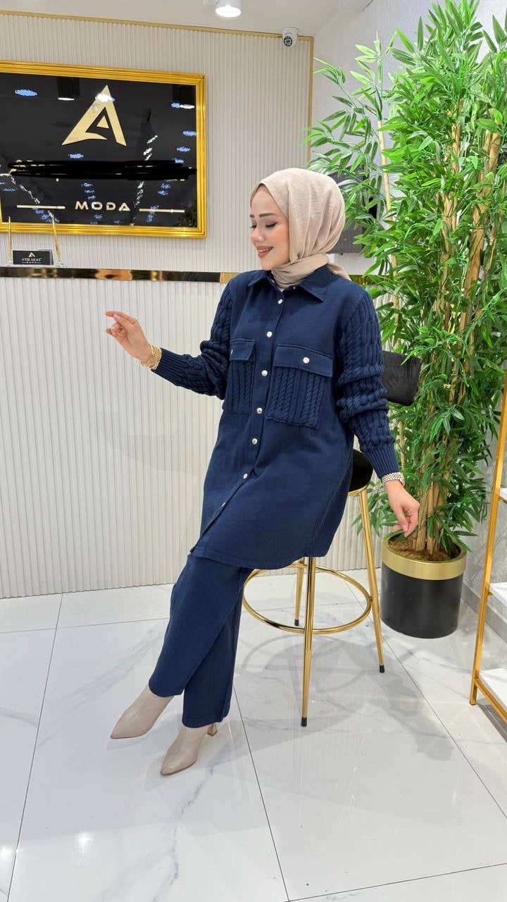 %100 pamuk kumaş ve triko detaylı takım, lacivert
