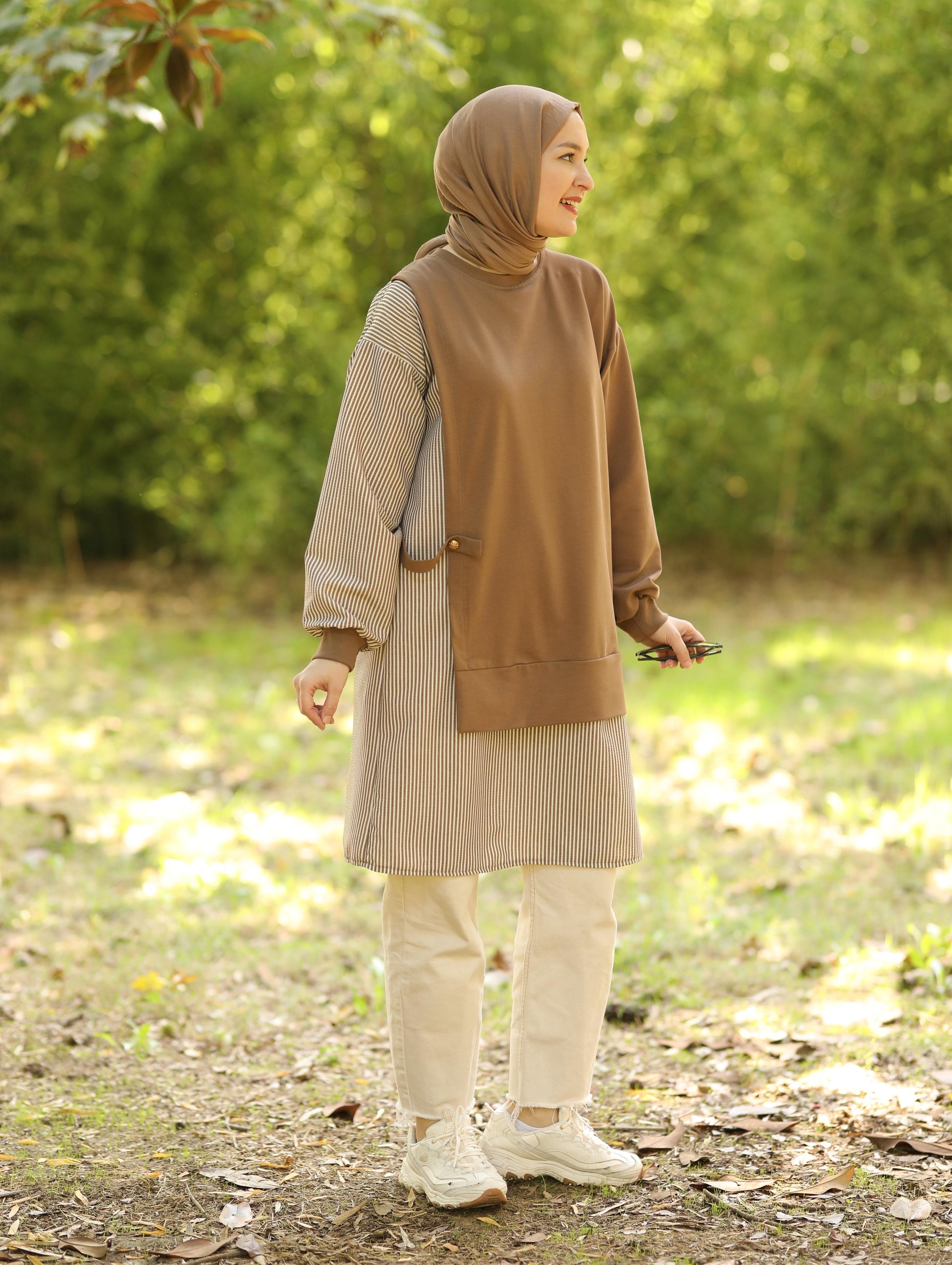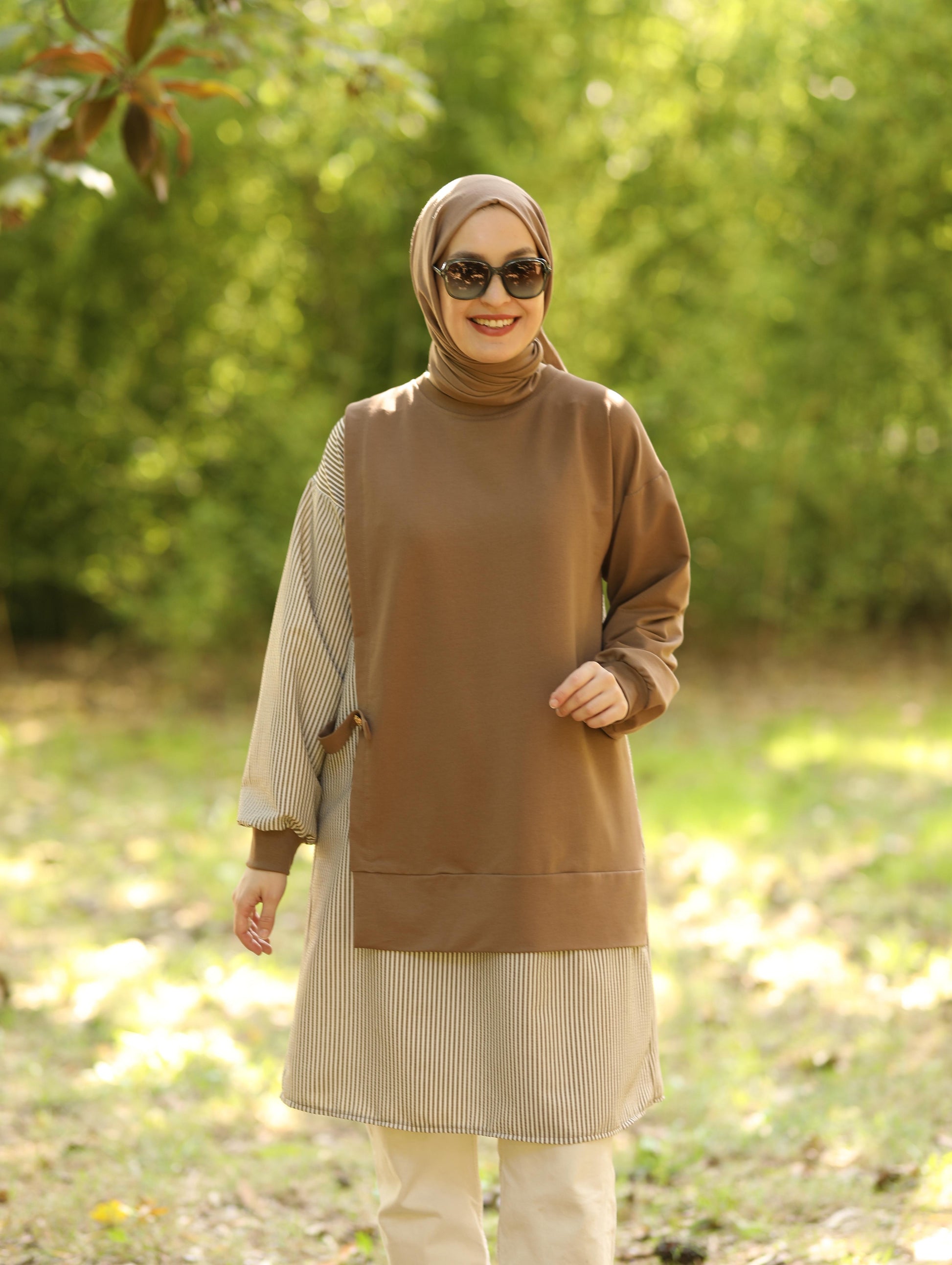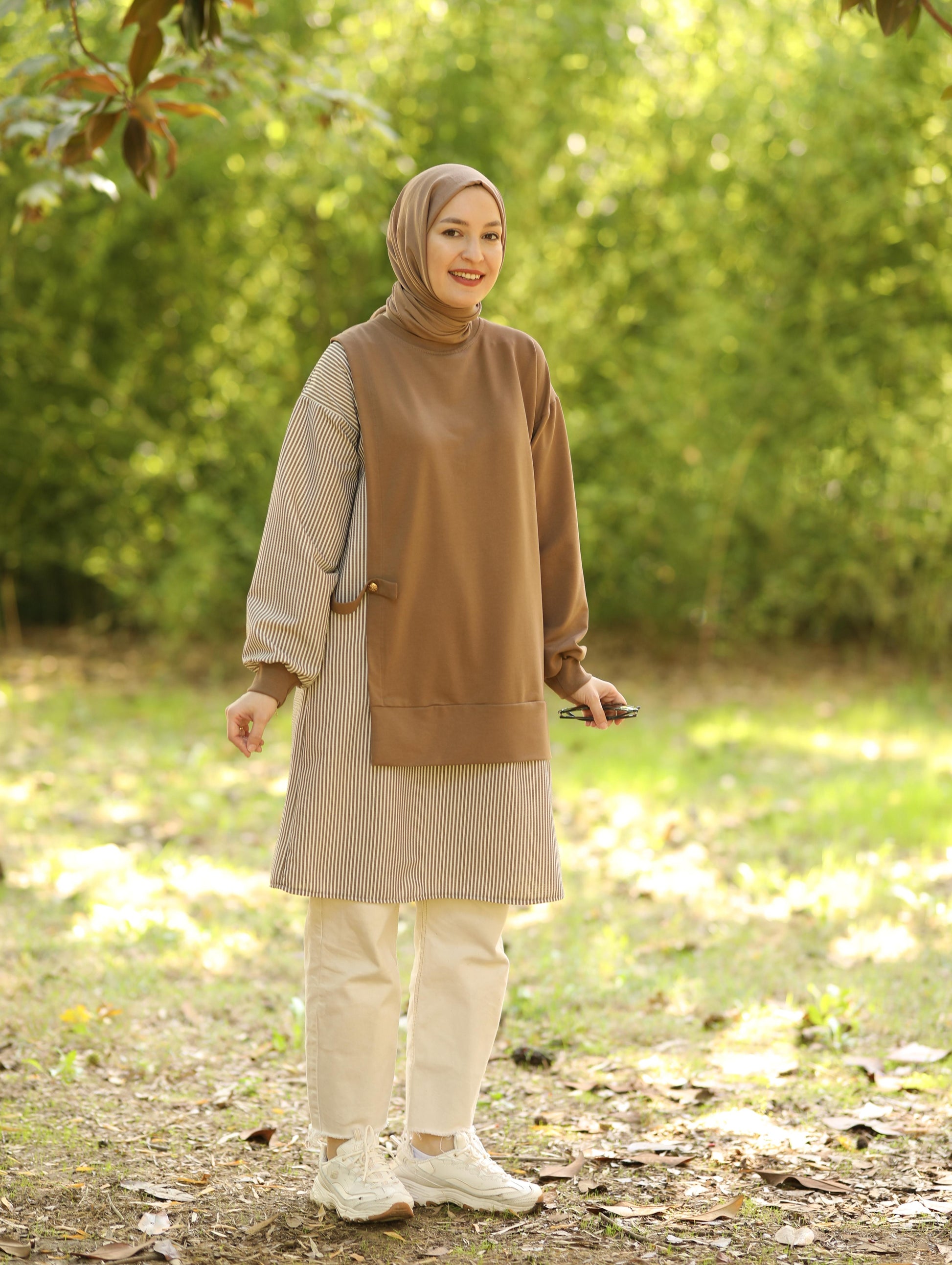 Sağ kolu ve etek ucunda kullanılan ince çizgili gömlek kumaşı ile size özgü bir tarz oluşturan modelimiz günlük kullanımda en kurtarıcı parçalarınızdan olacak.