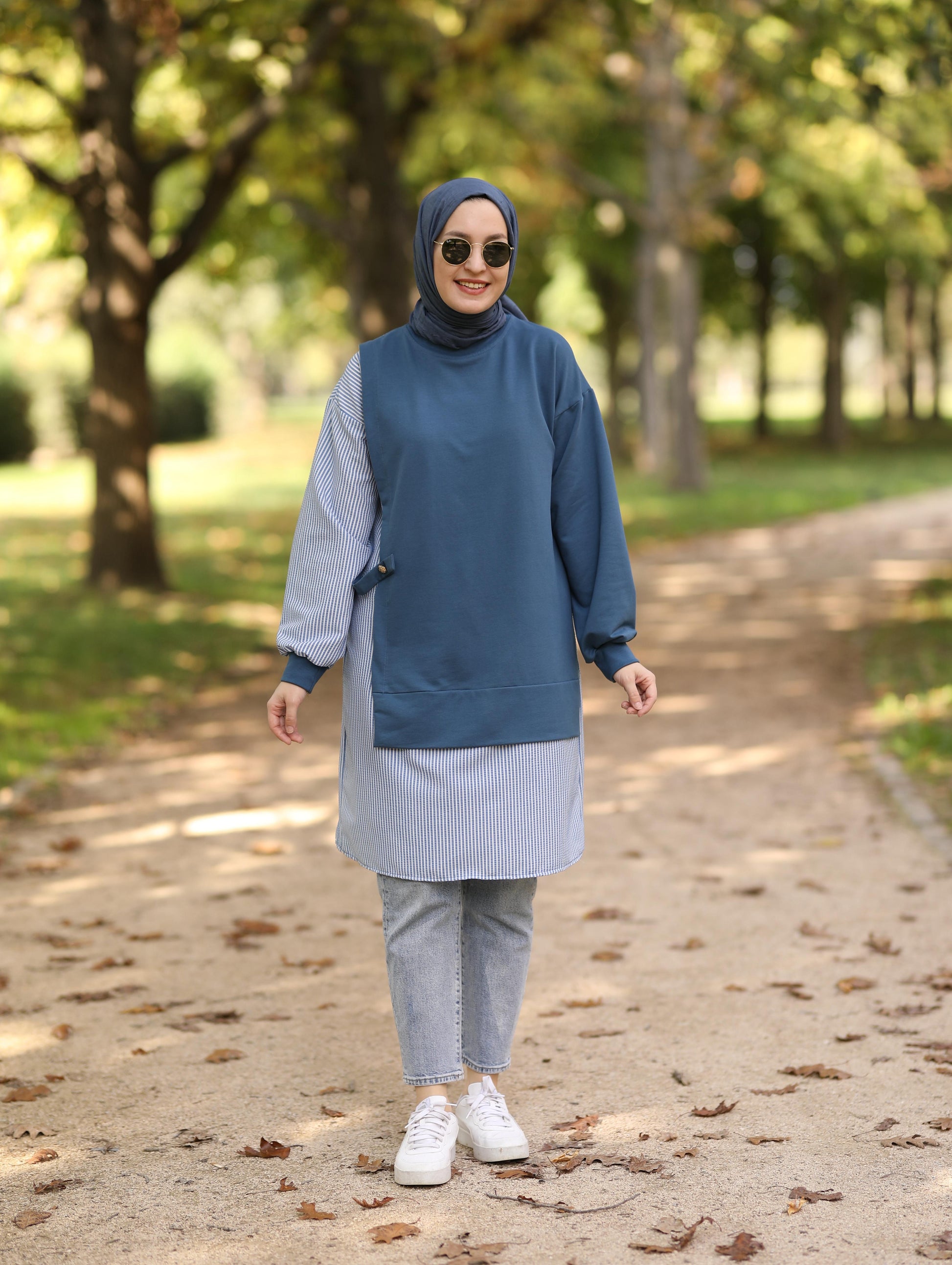 Gofre detaylı uzun sweat tunik, indigo