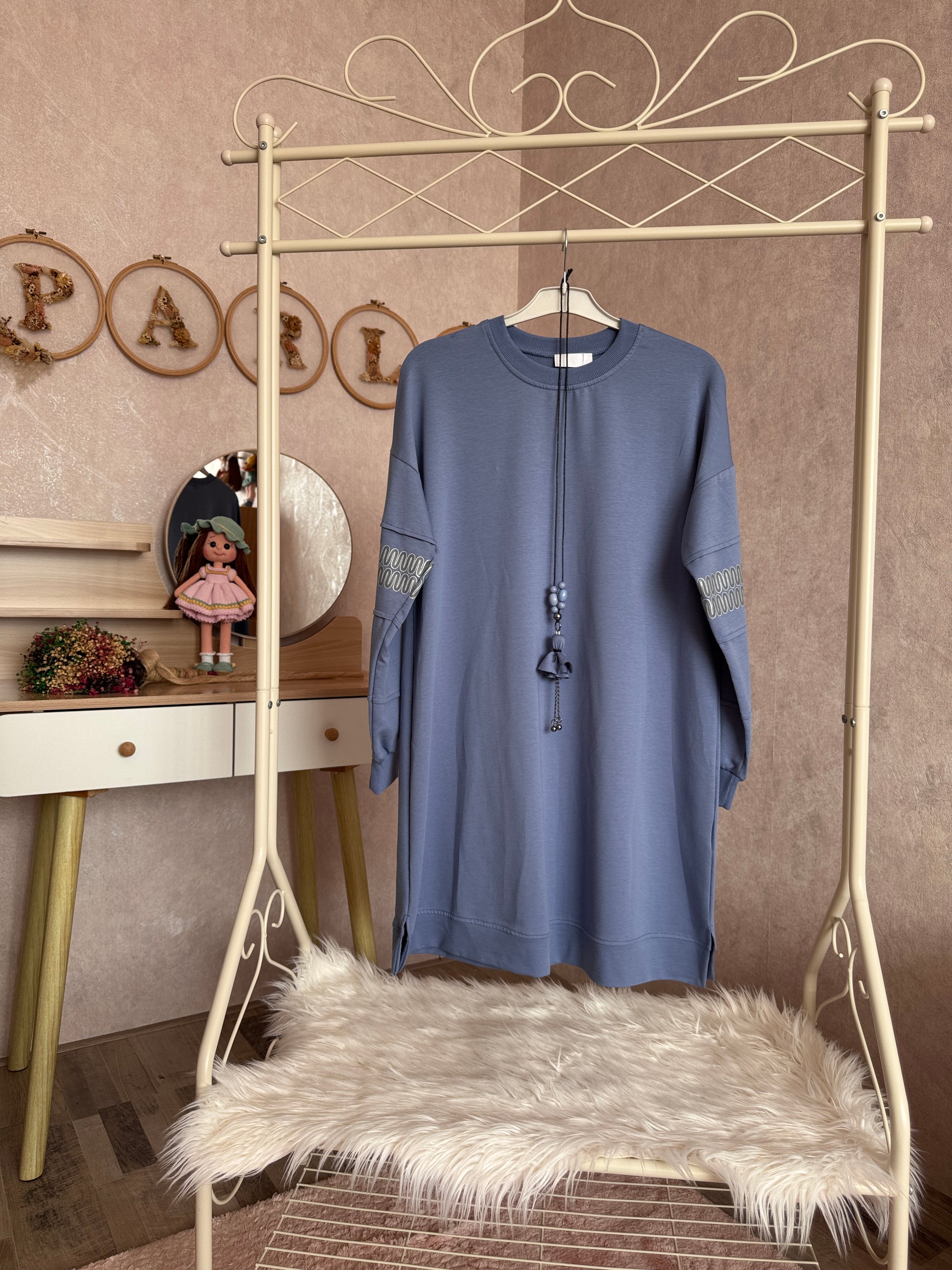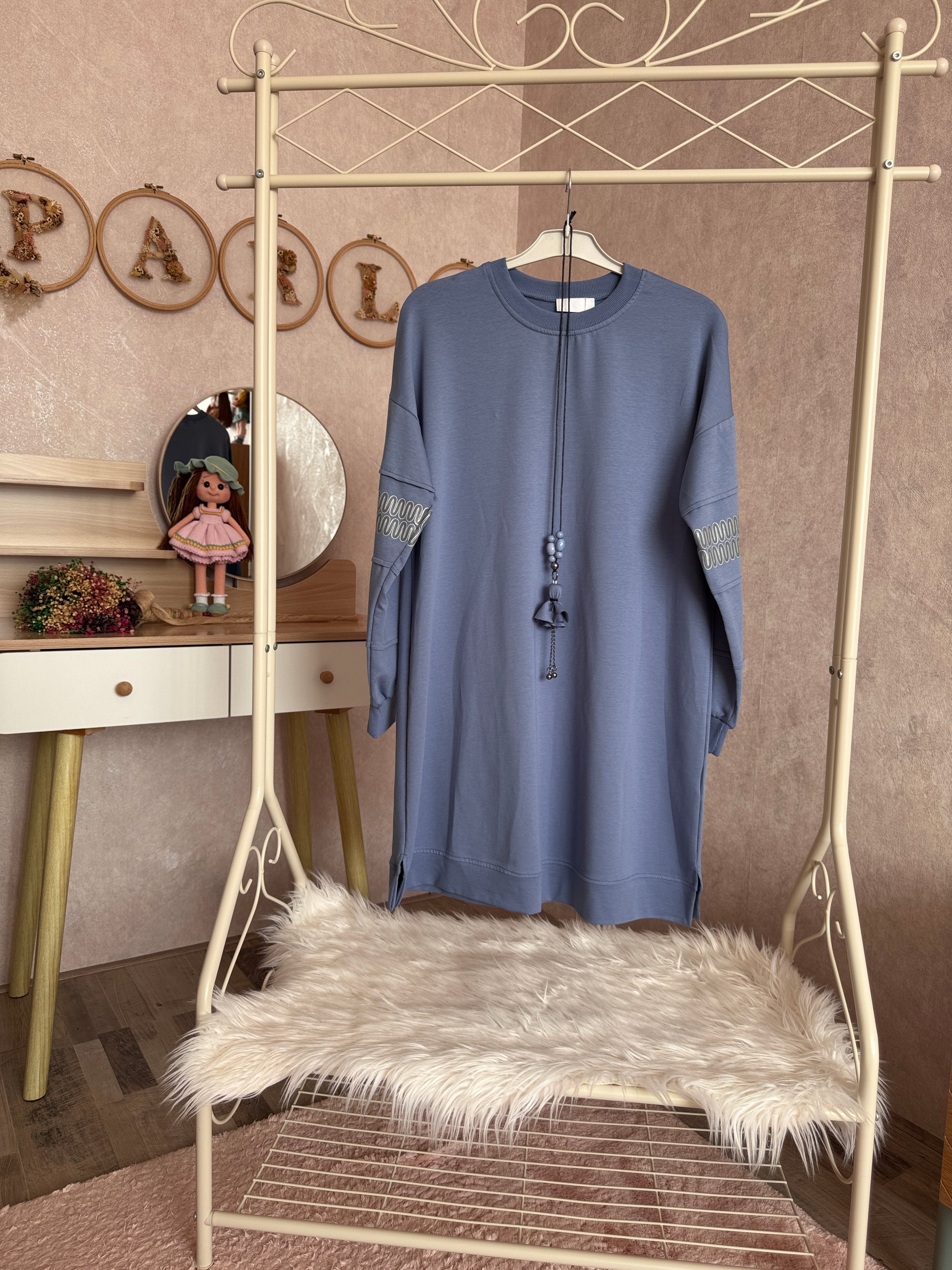 İki iplik penye tunik, kolları zikzak detaylı, mavi