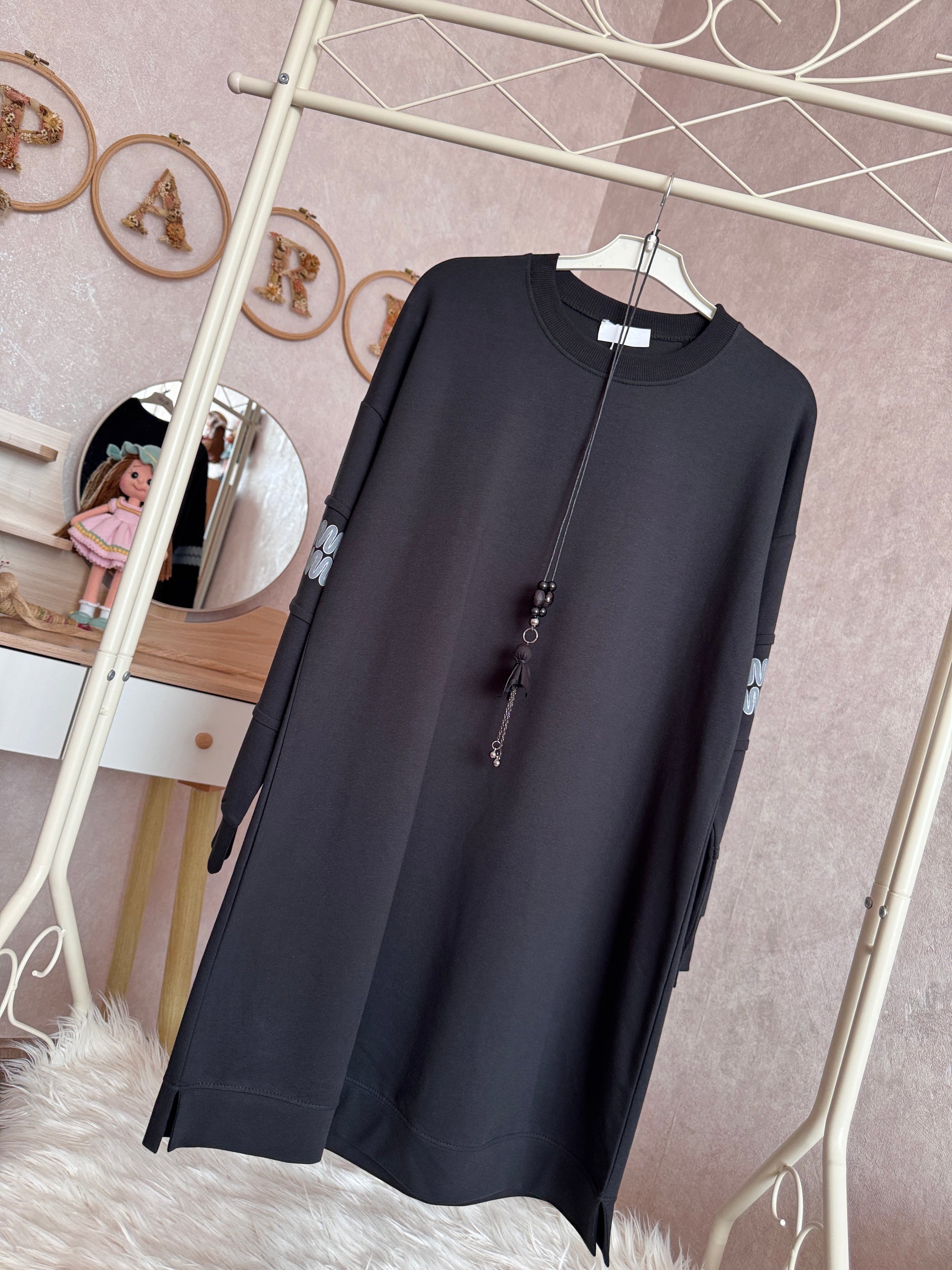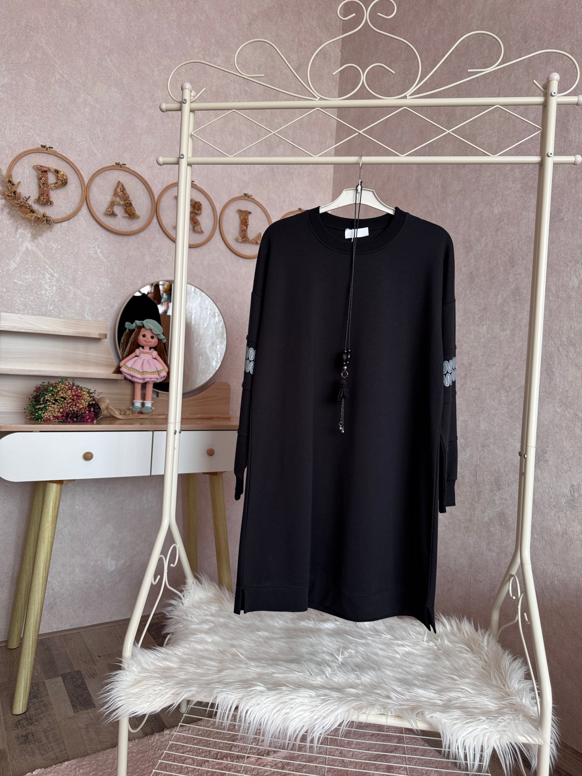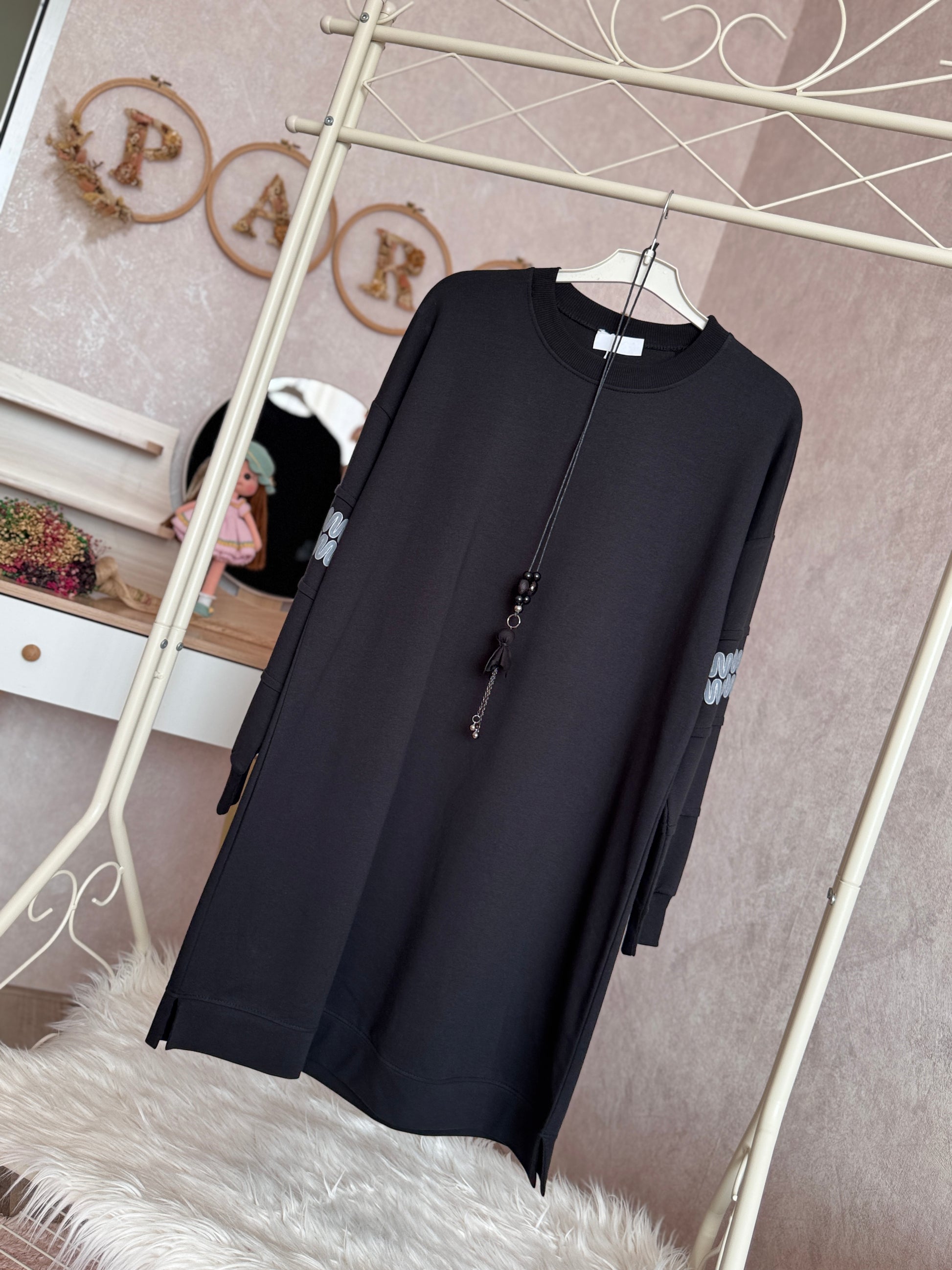 İki iplik penye tunik, kolları zikzak detaylı, siyah
