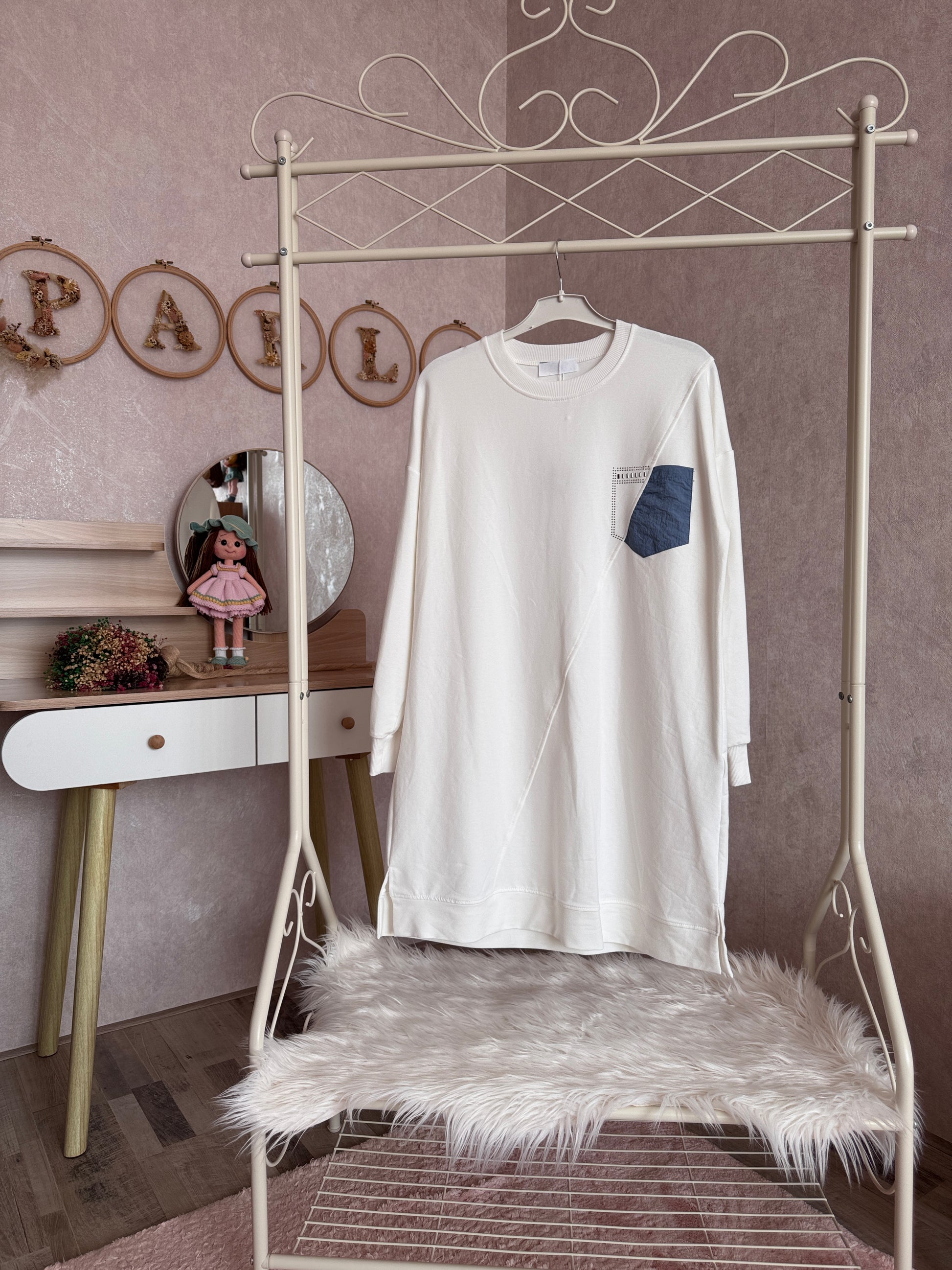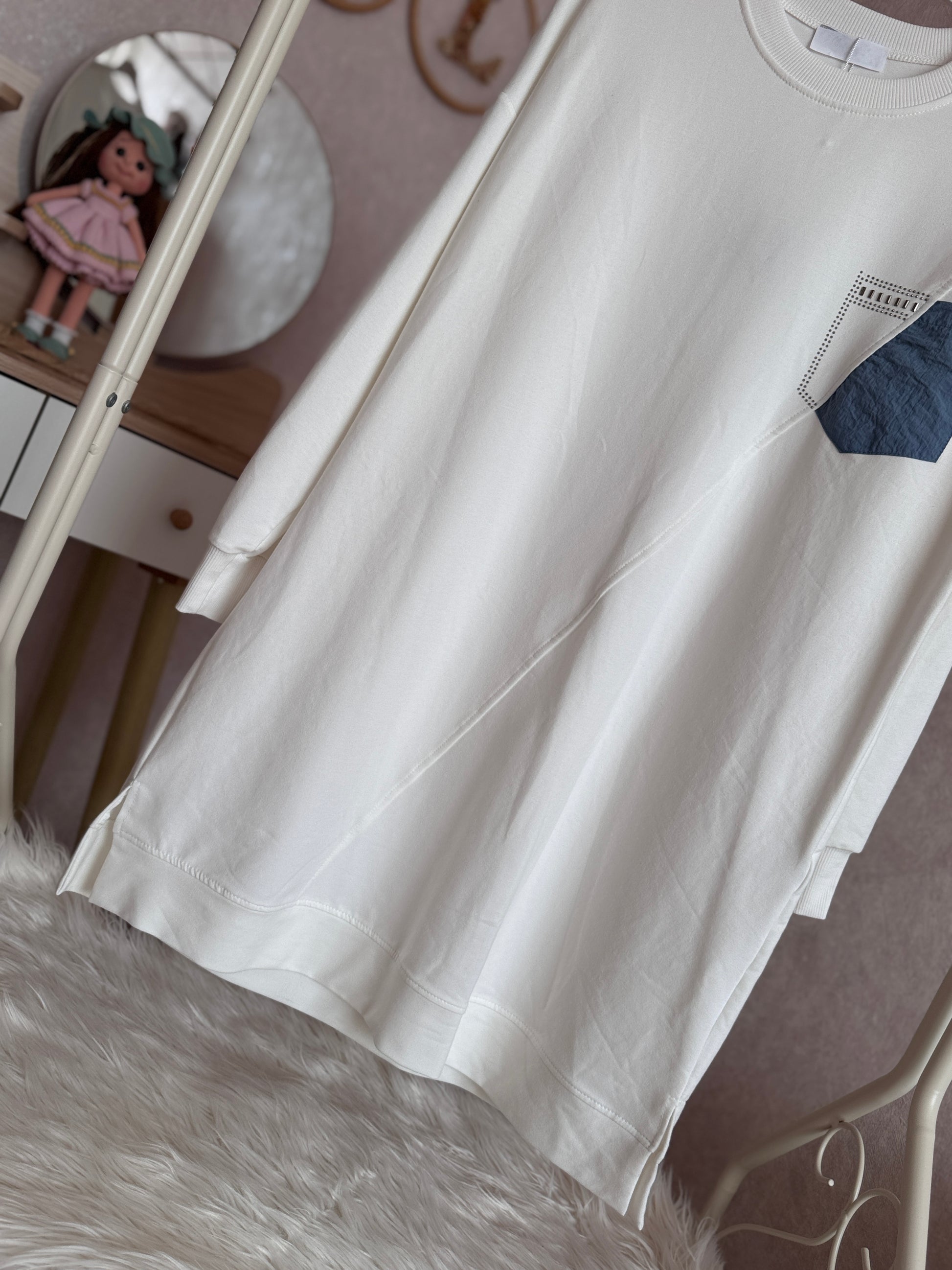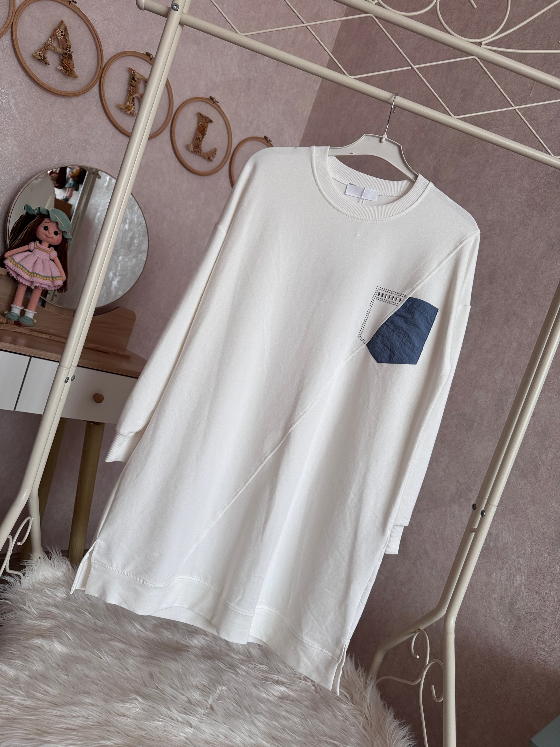 İki iplik penye tunik, yaka cep detaylı, beyaz