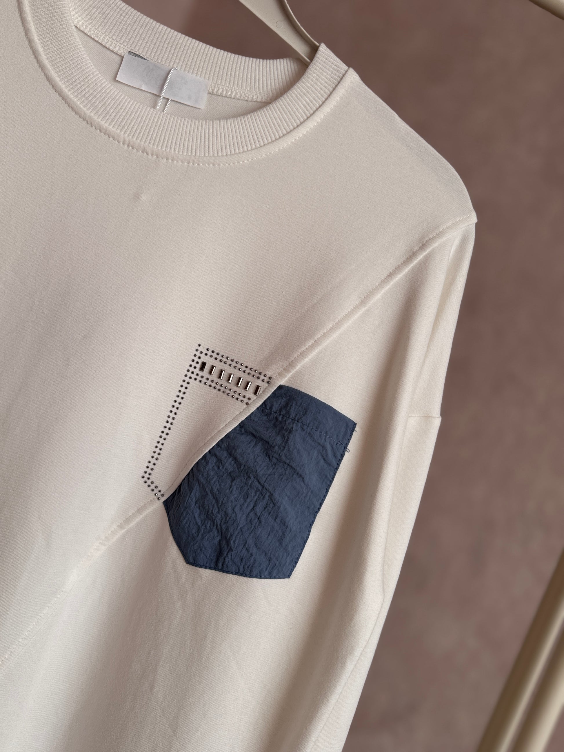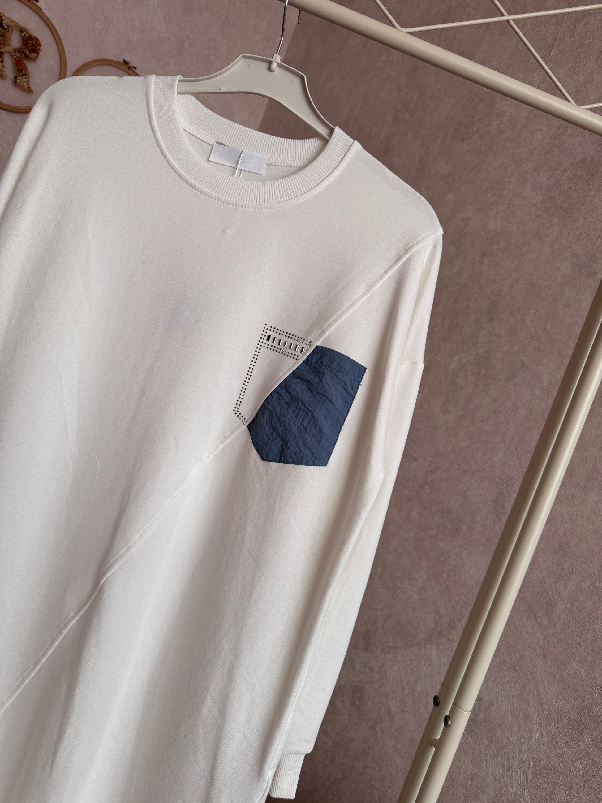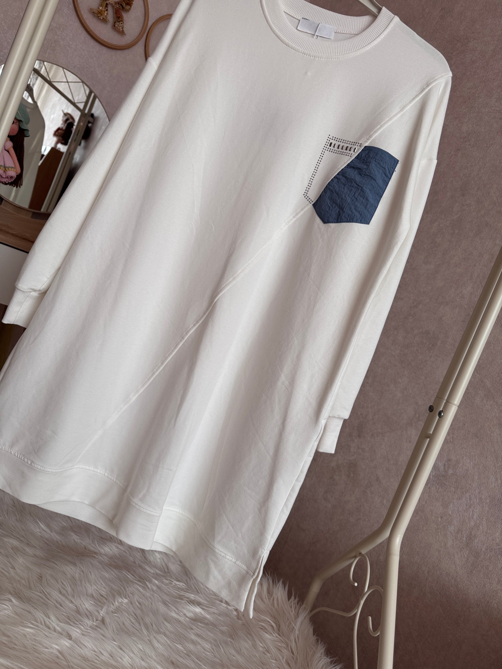 İki iplik penye tunik, yaka cep detaylı, beyaz