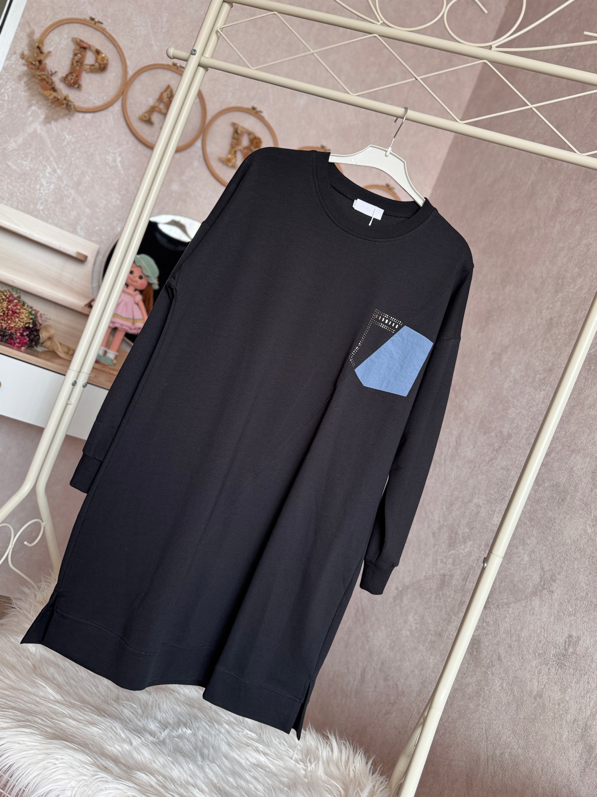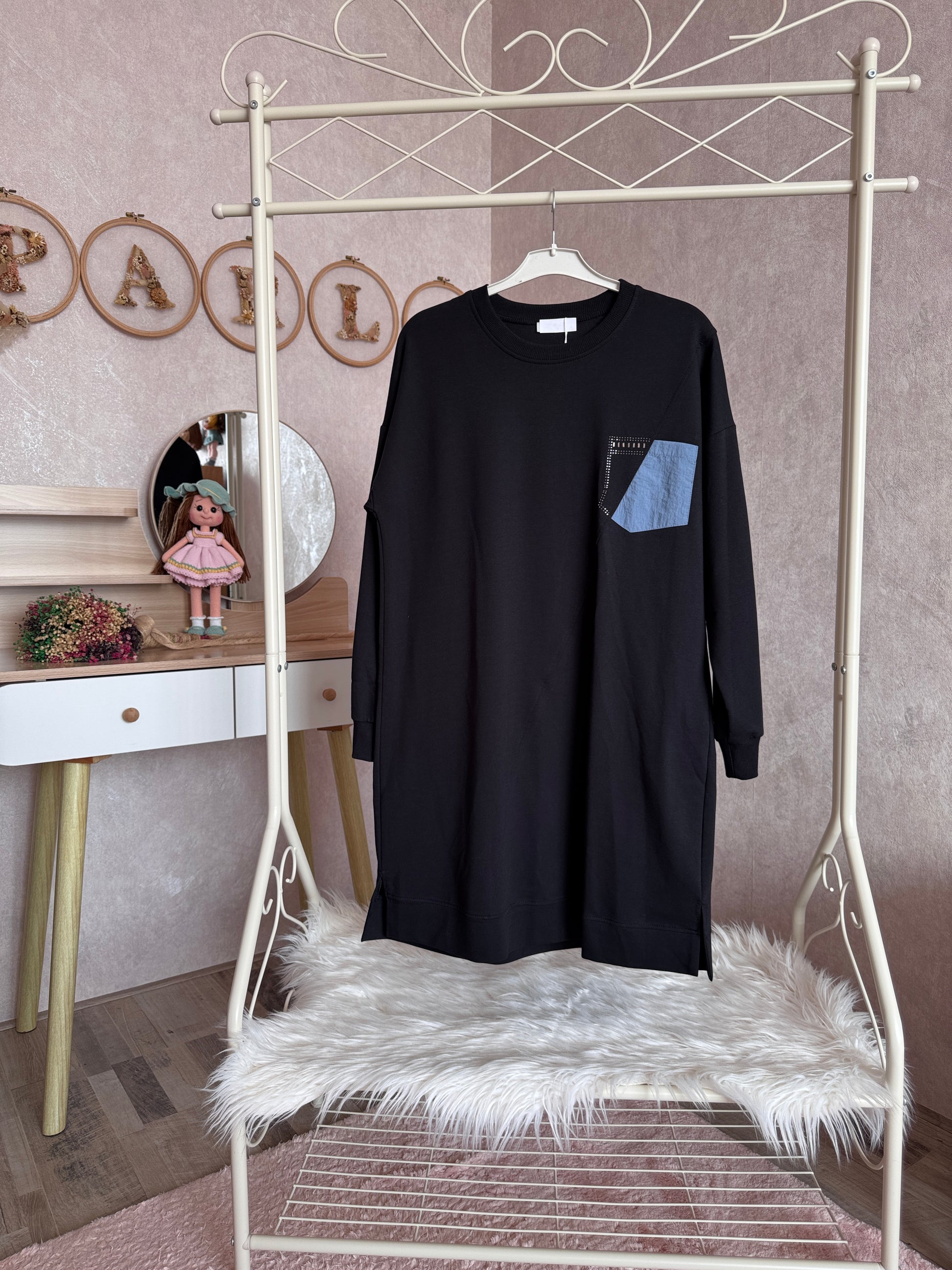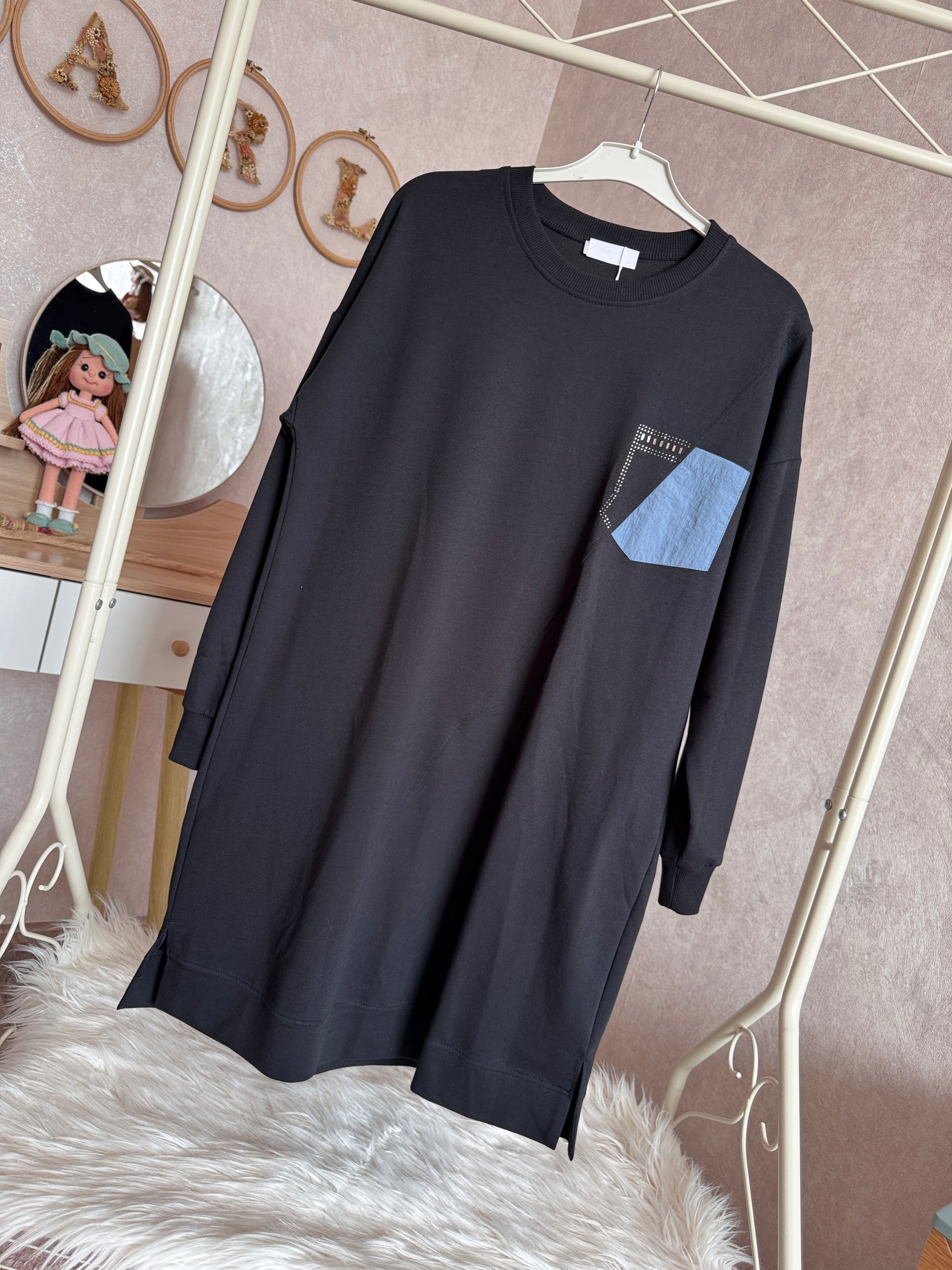 İki iplik penye tunik, yaka cep detaylı, siyah