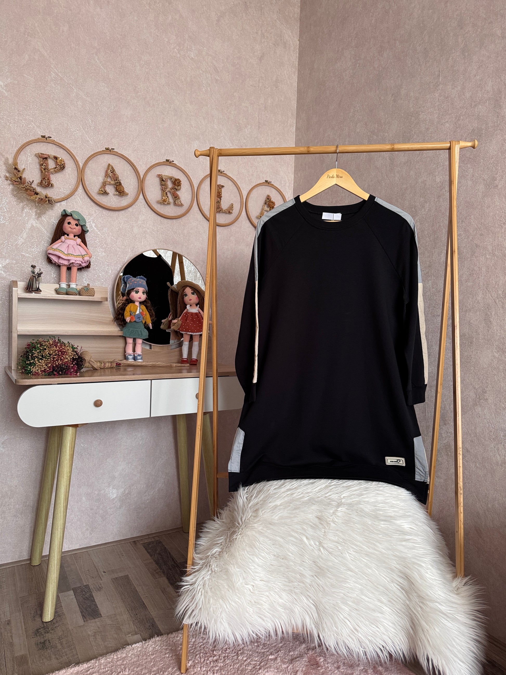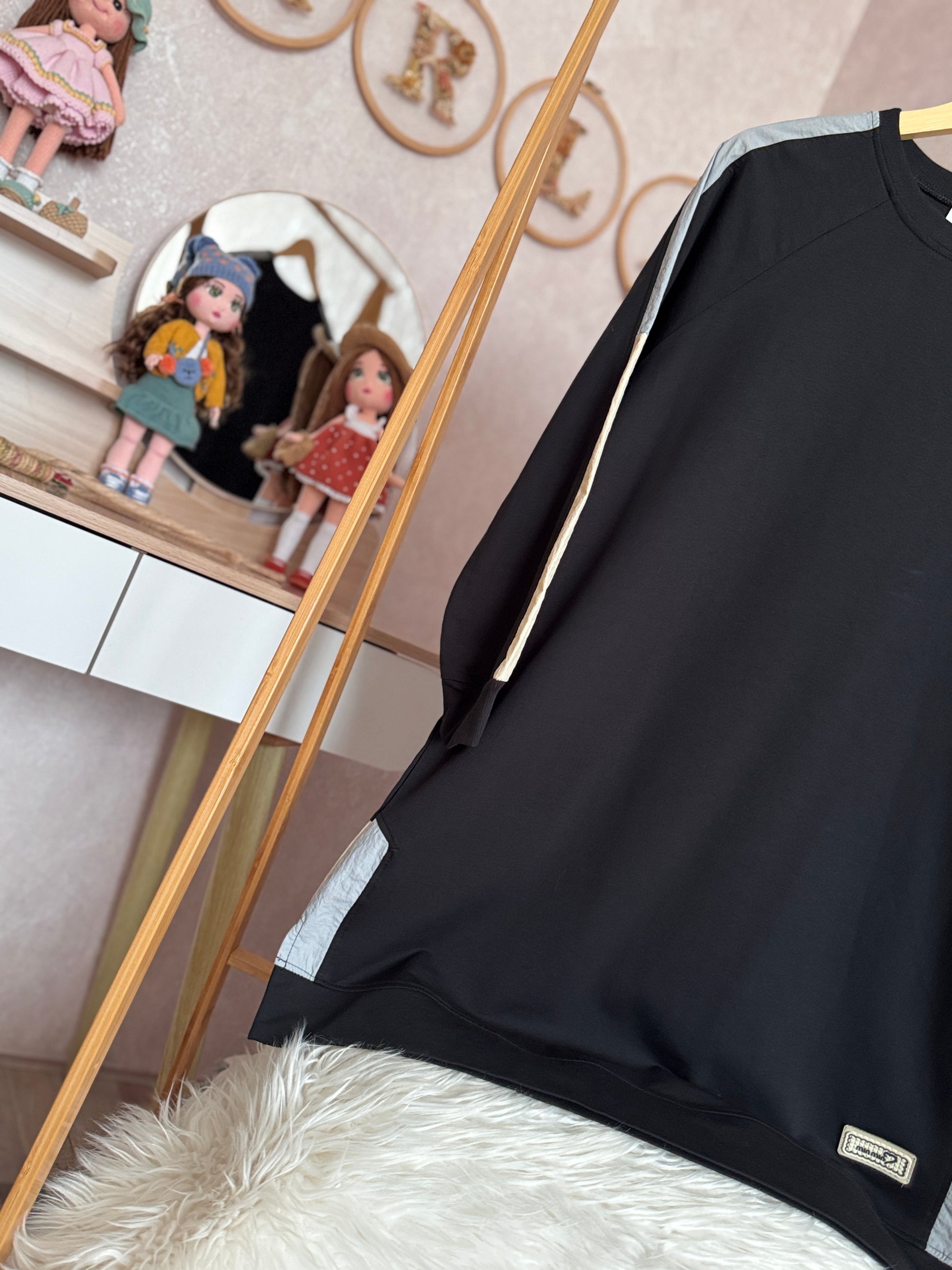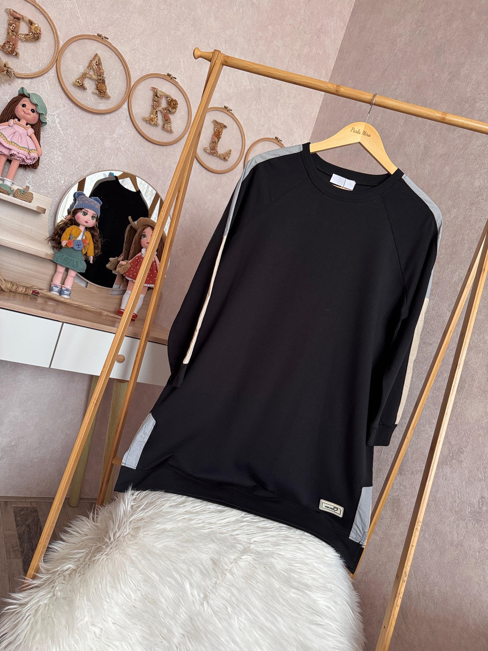 İki iplik penye tunik, kol ve omuz paraşüt detaylı, siyah