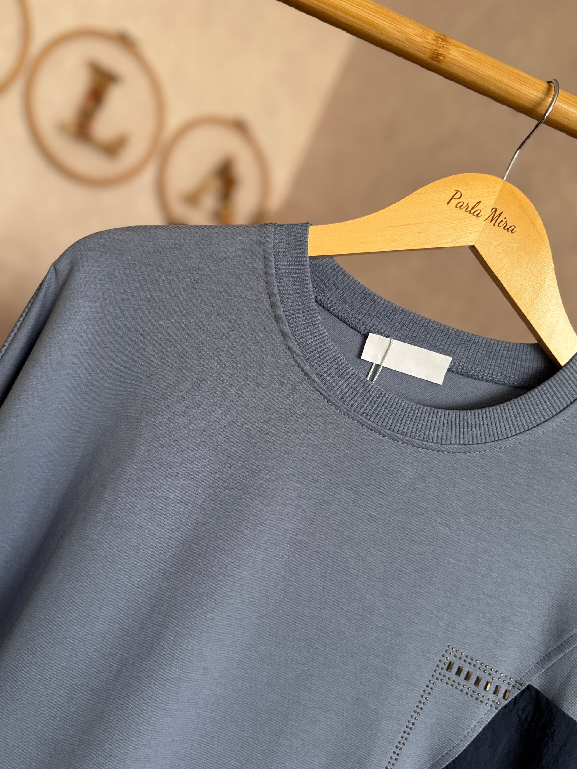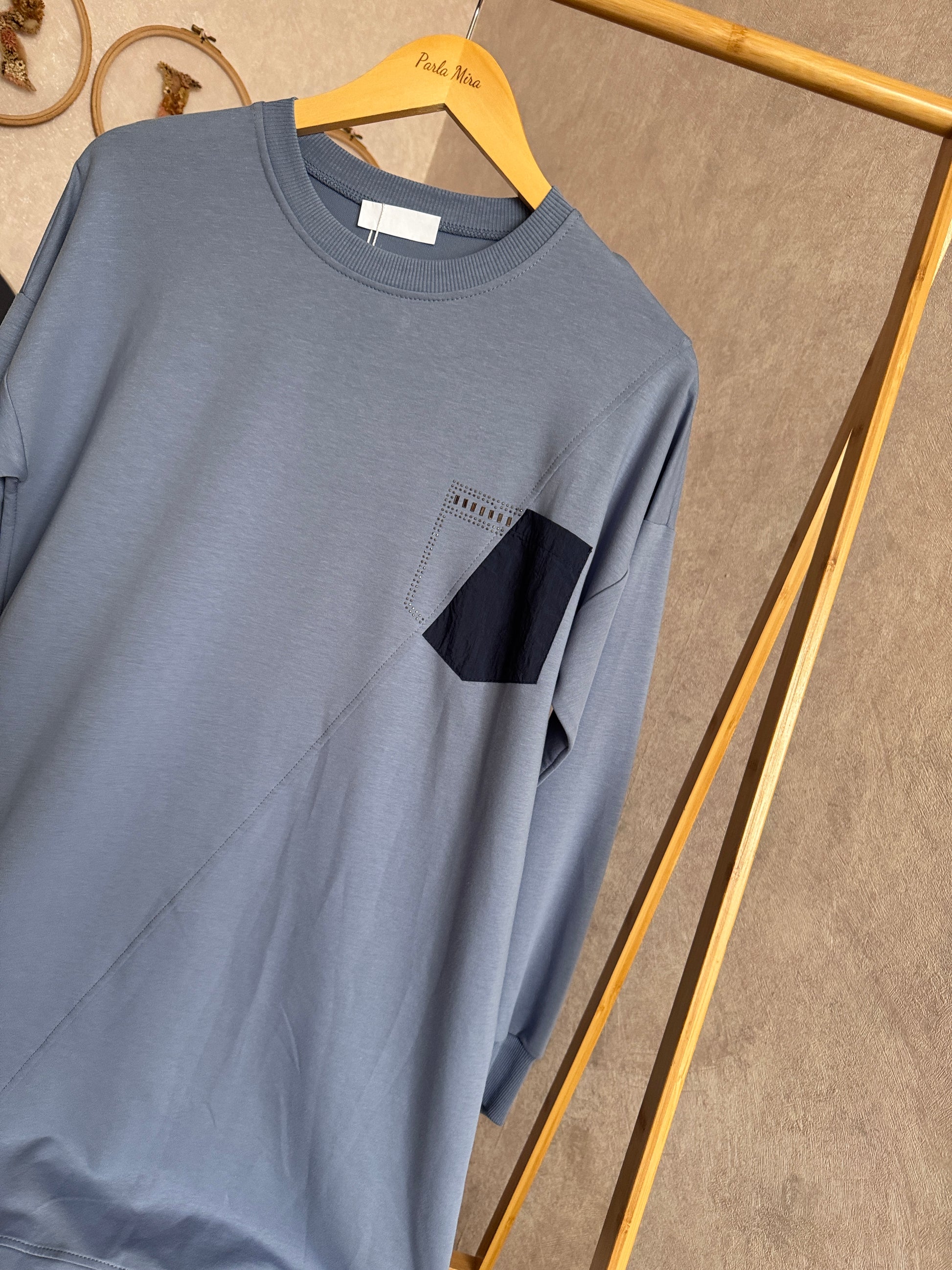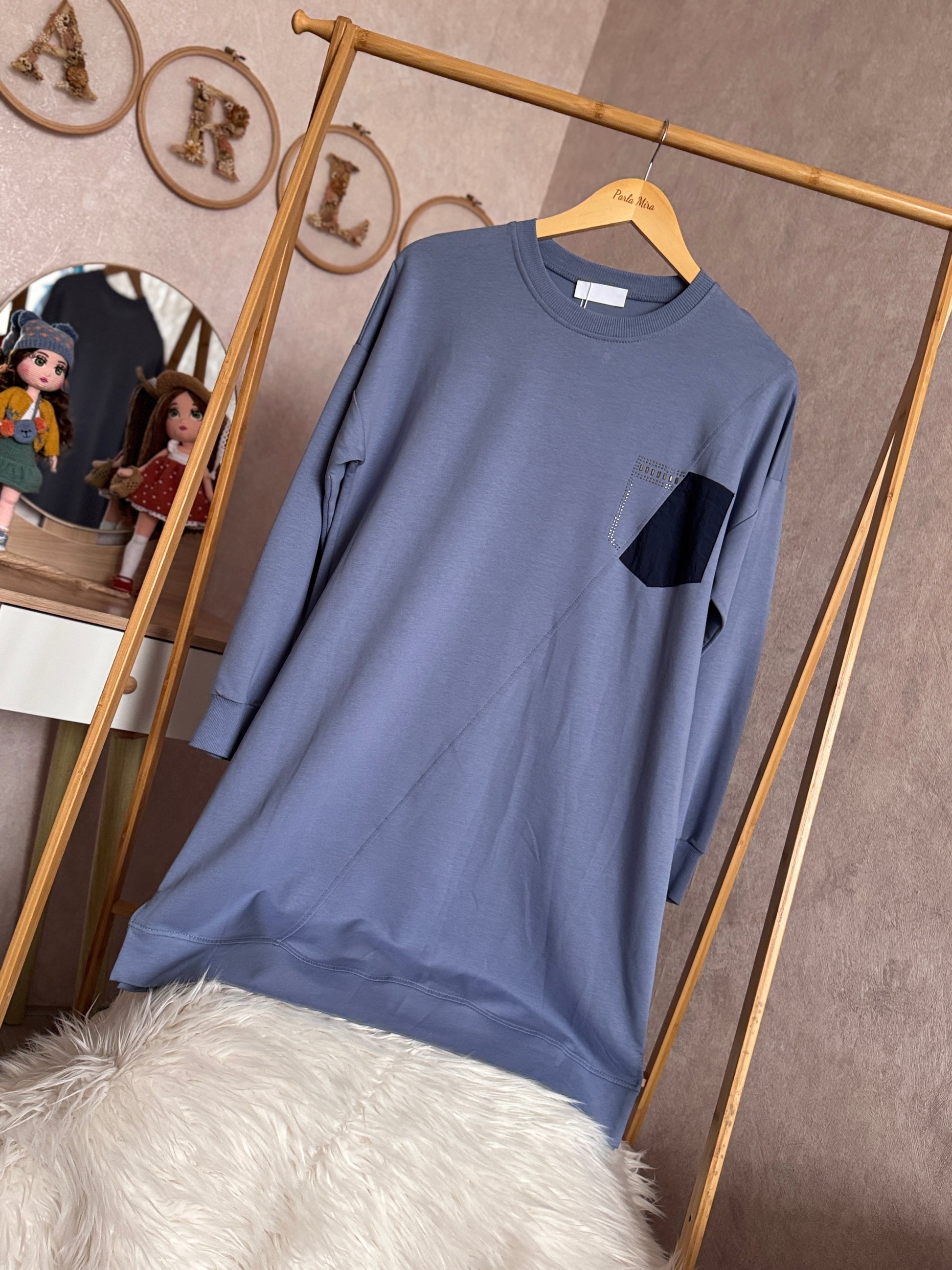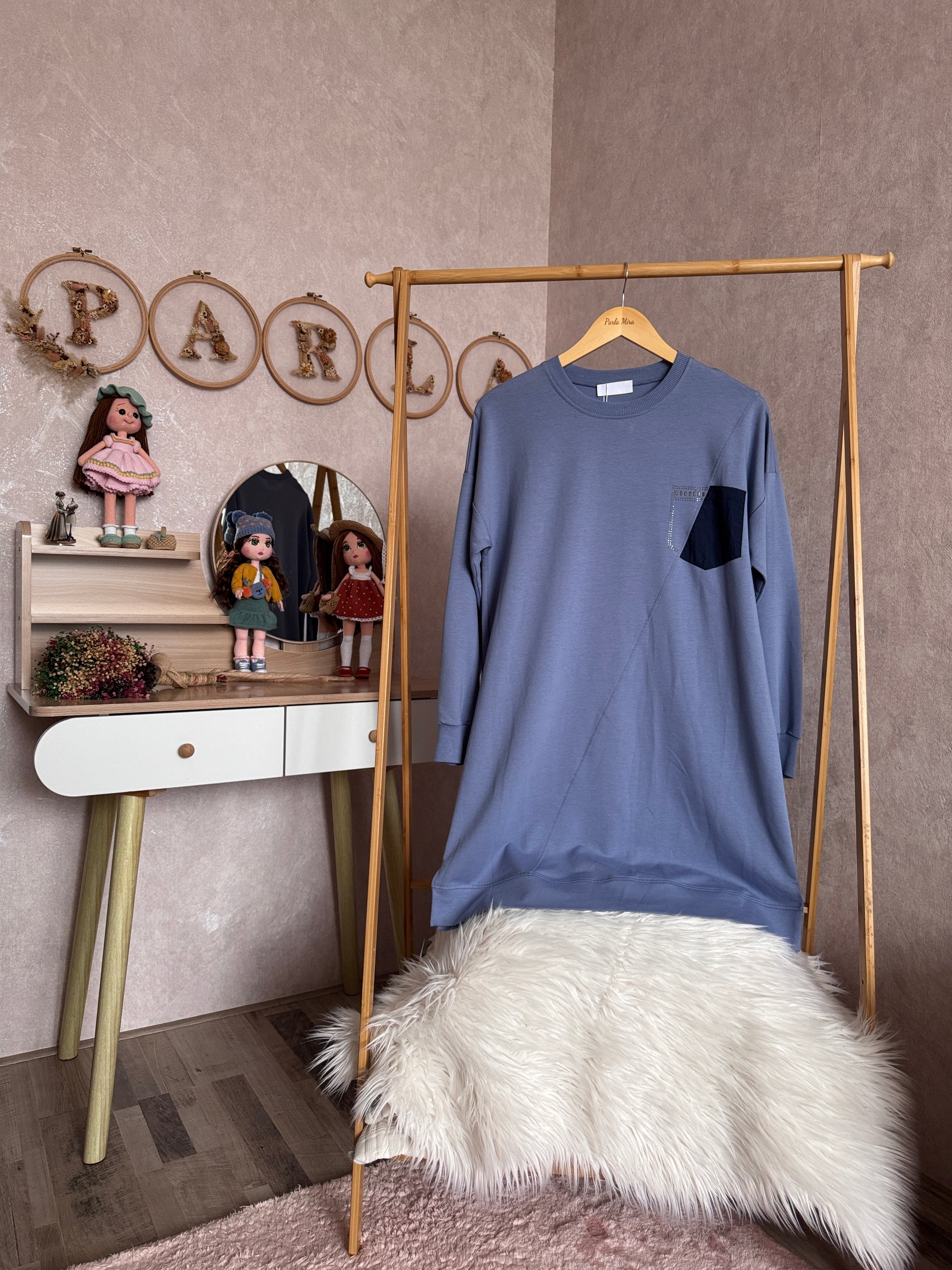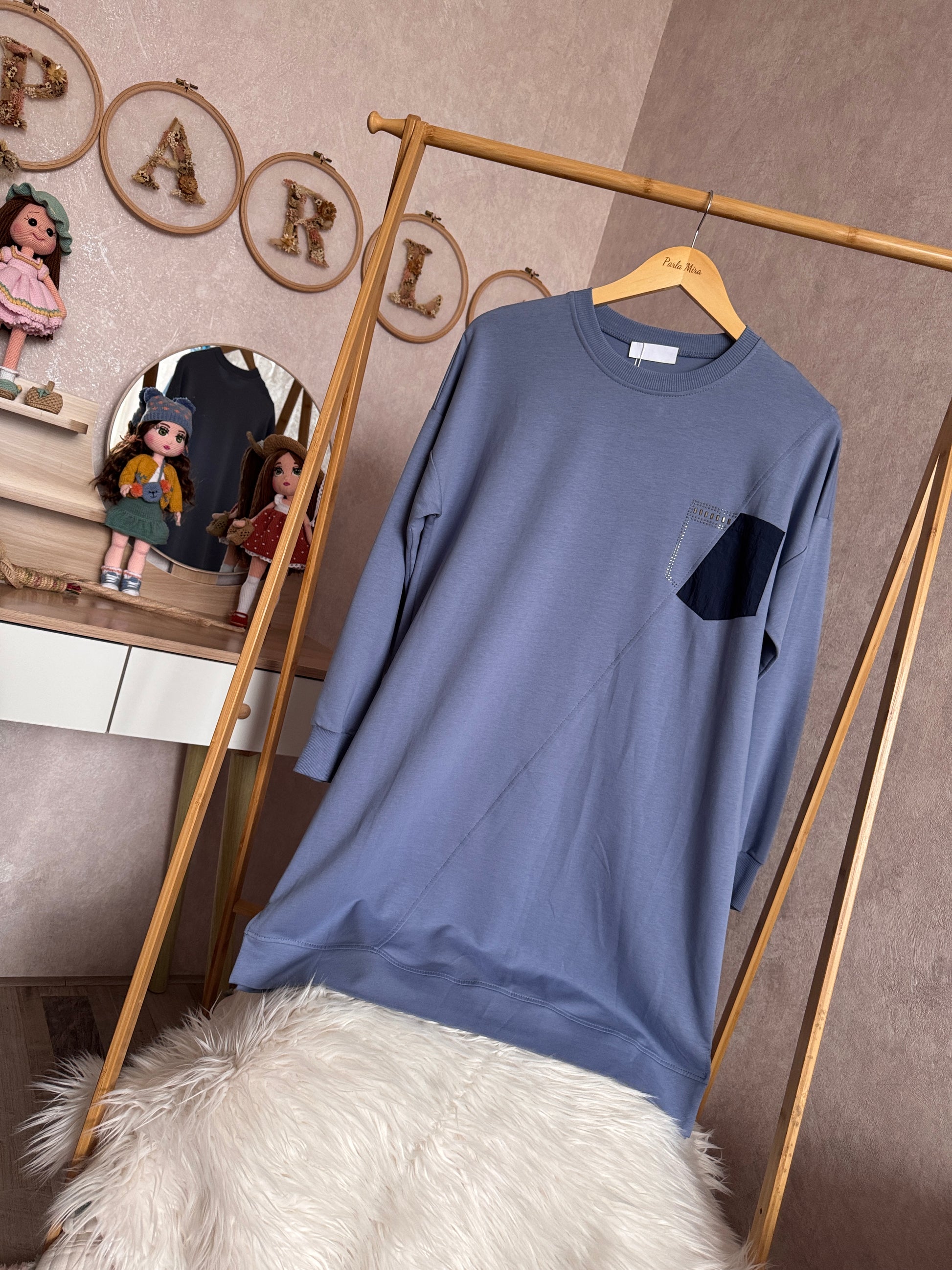 İki iplik penye tunik, yaka cep detaylı, mavi