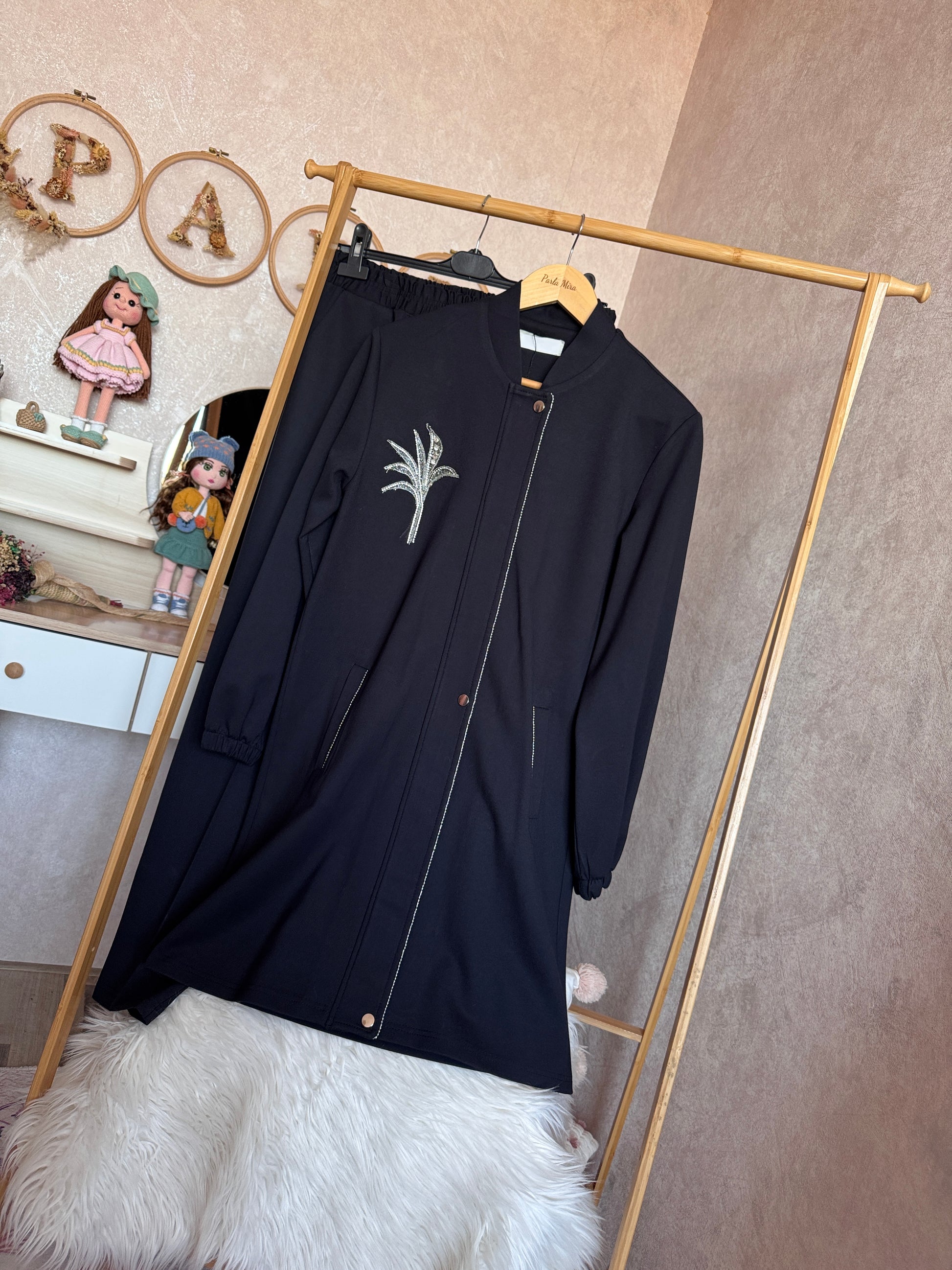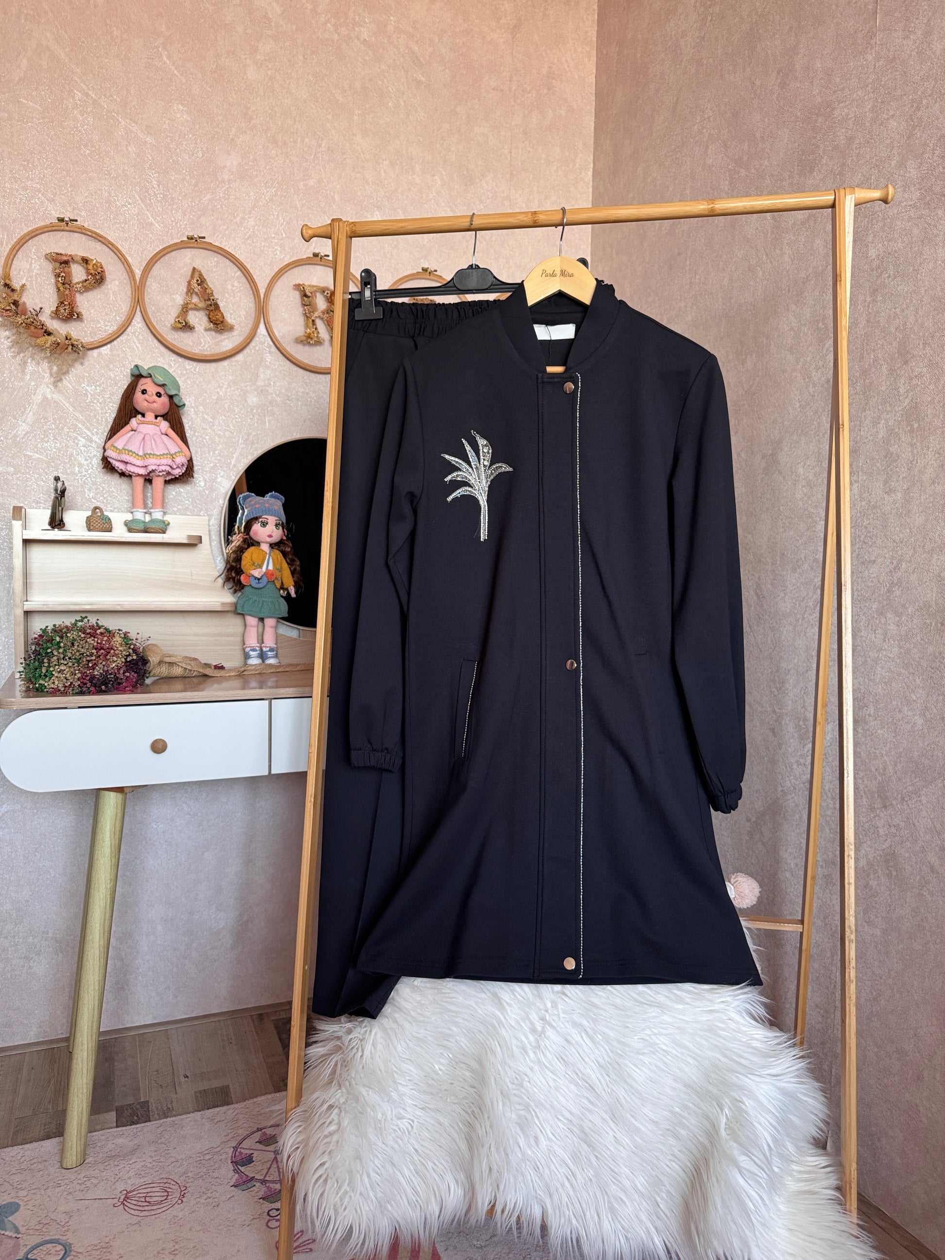 Önden fermuarlı, yaka işlemeli çiçek detaylı takım