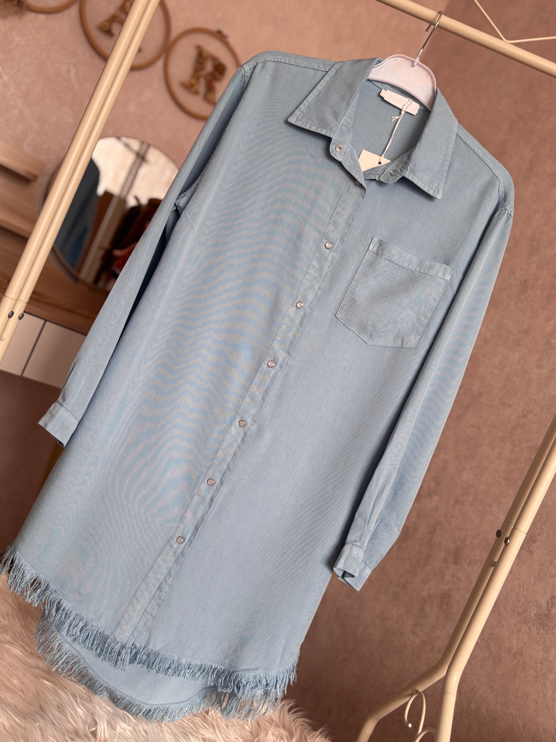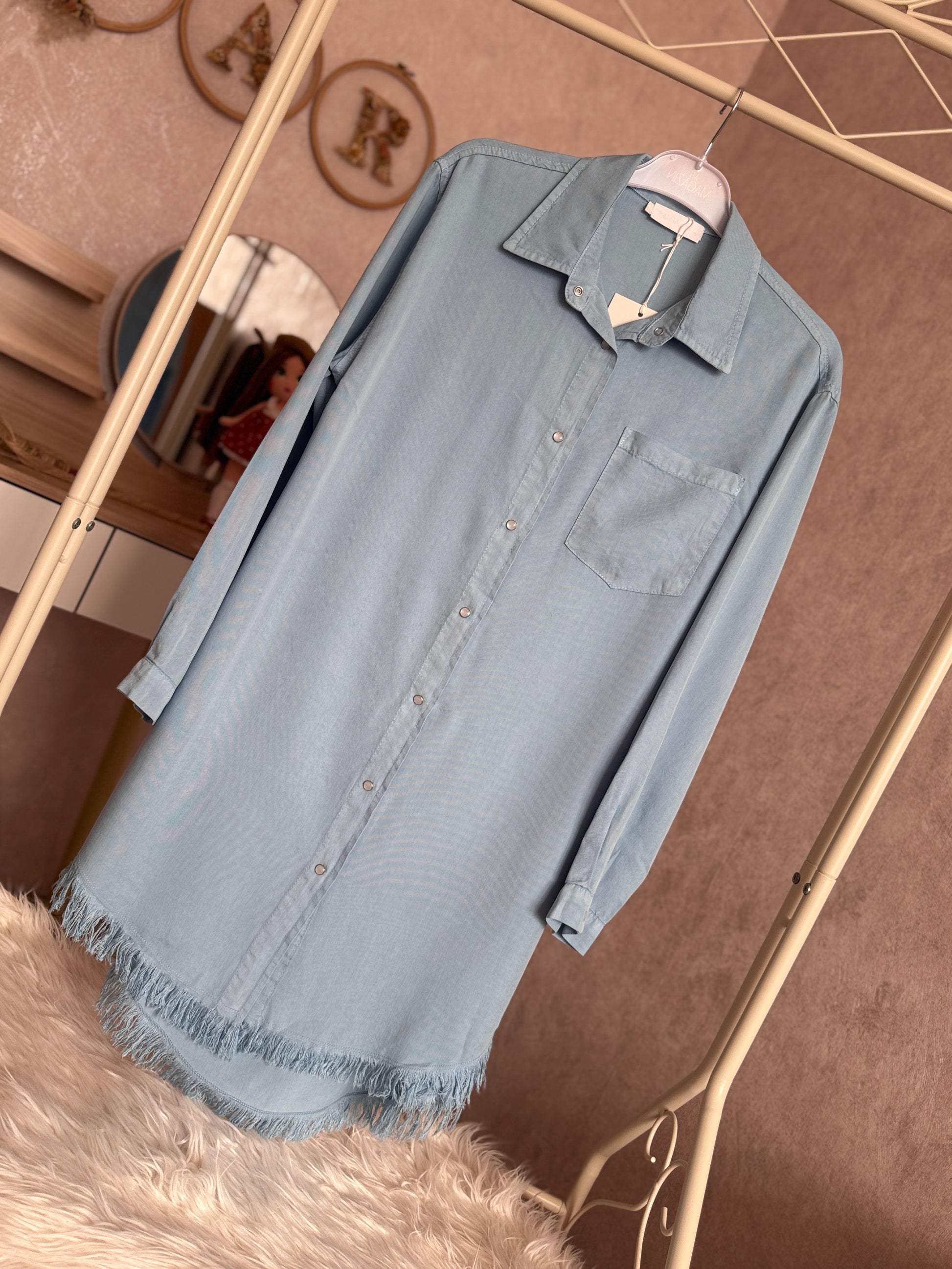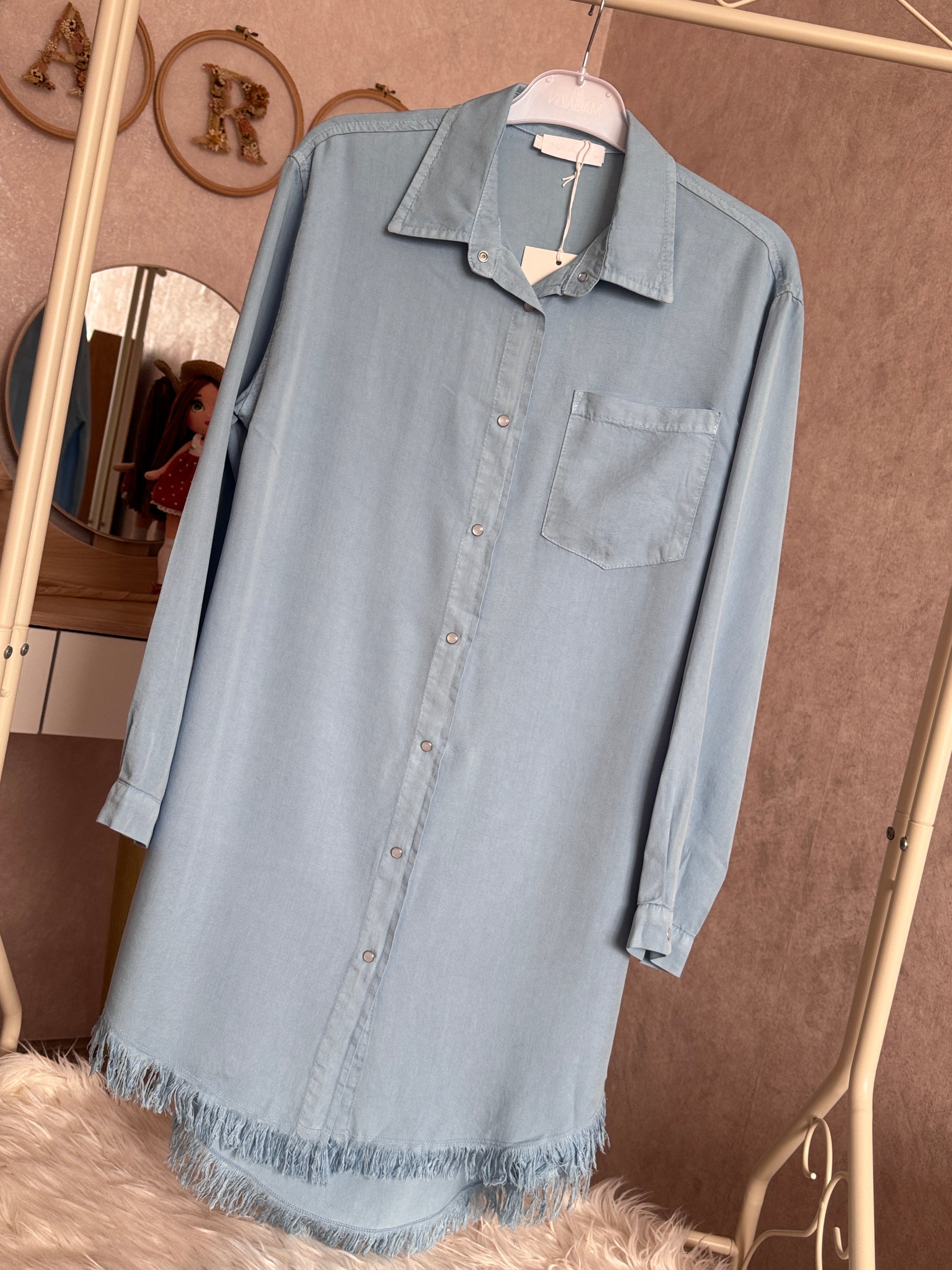 Tensel kumaş püsküllü gömlek tunik, mavi