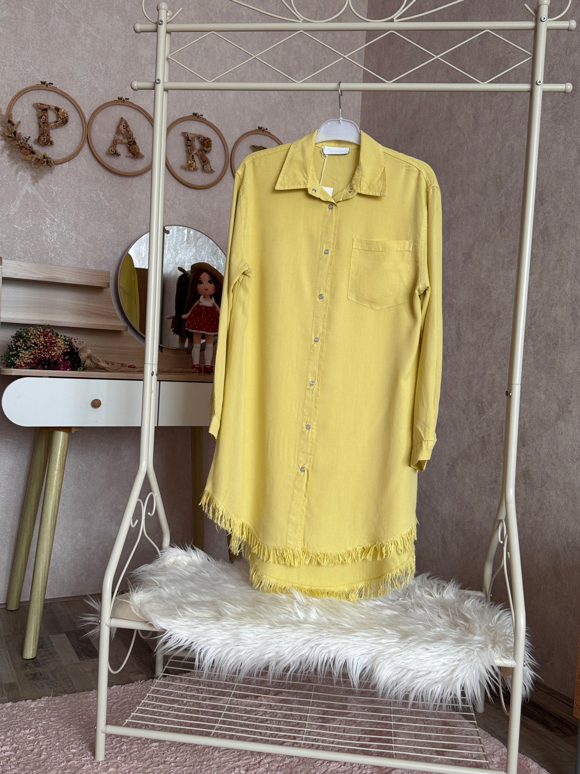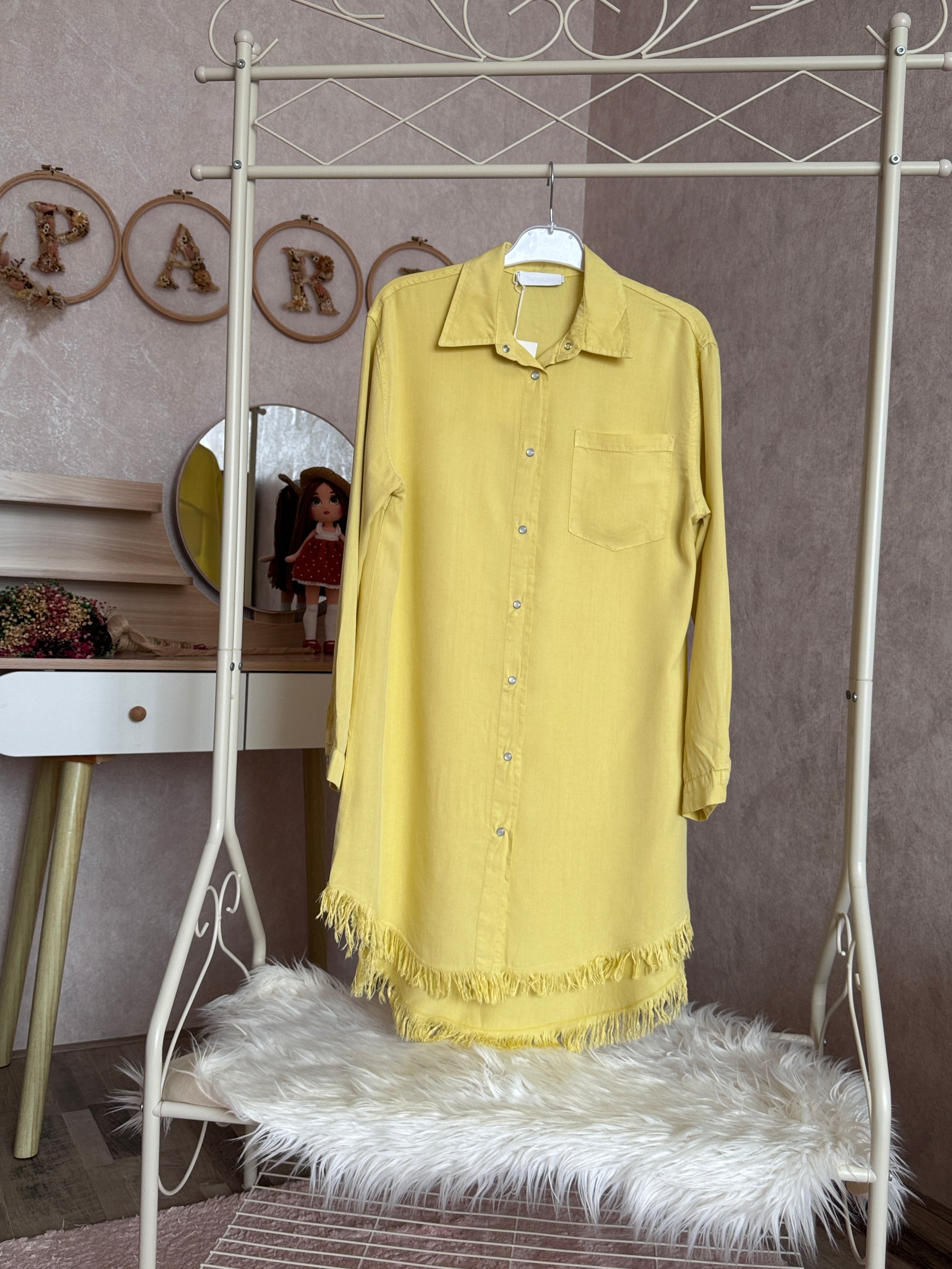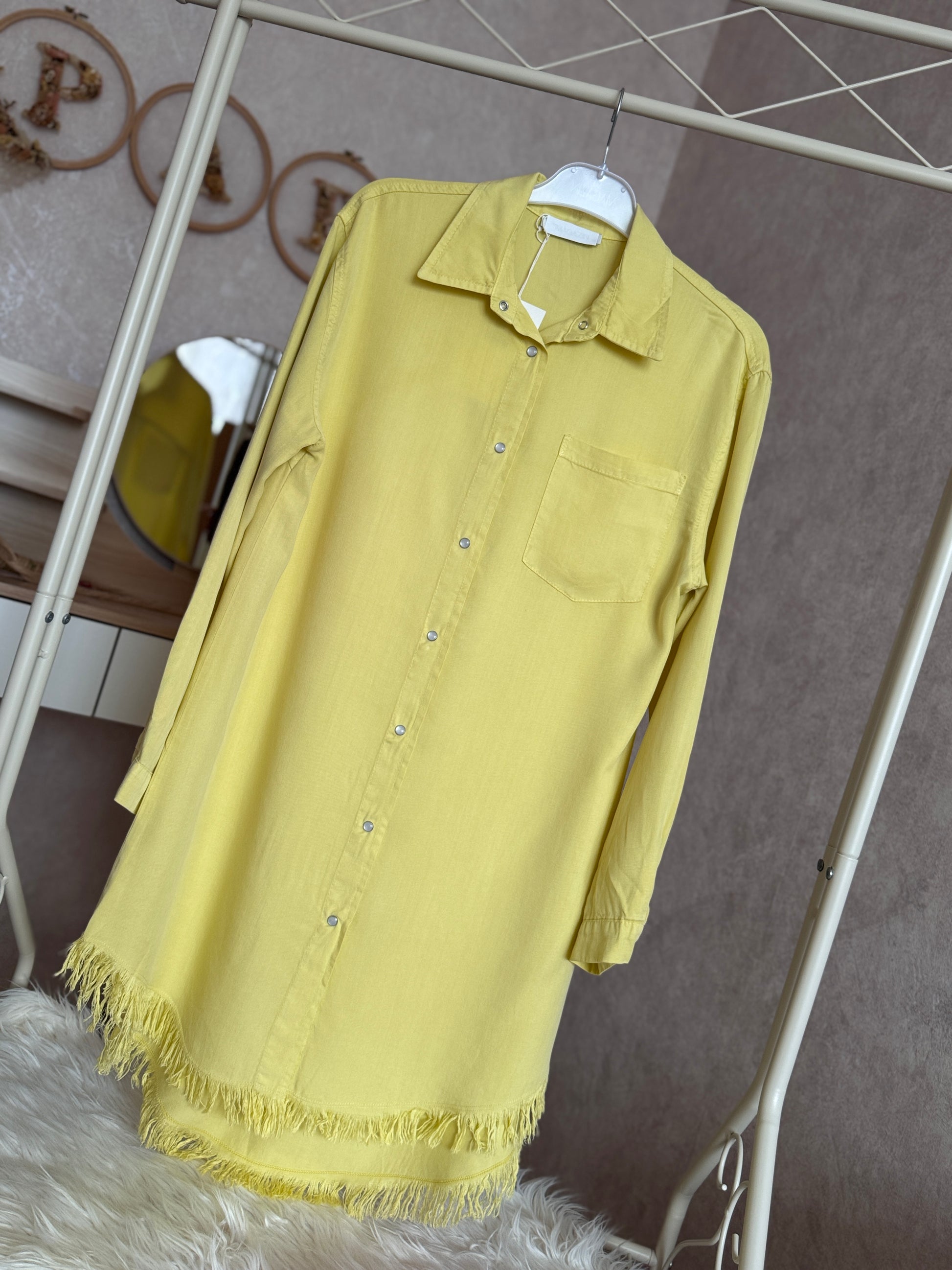 Tensel kumaş püsküllü gömlek tunik, sarı