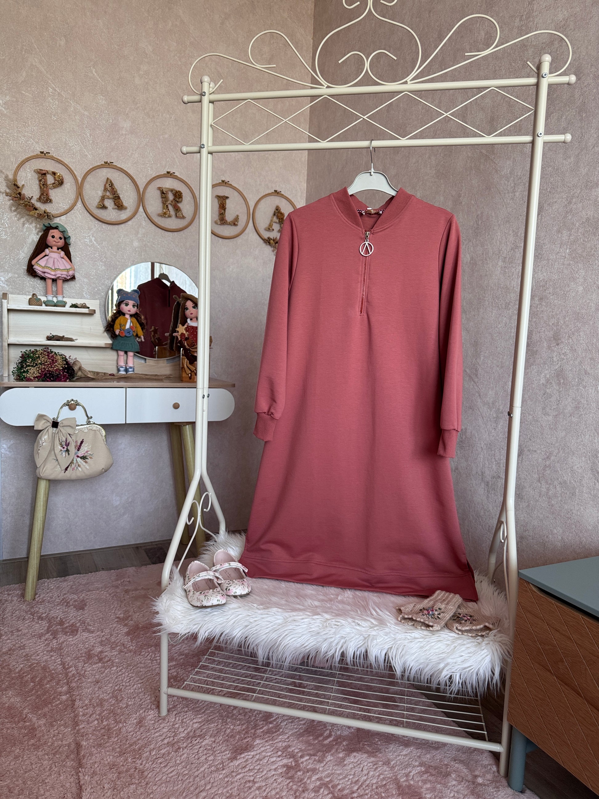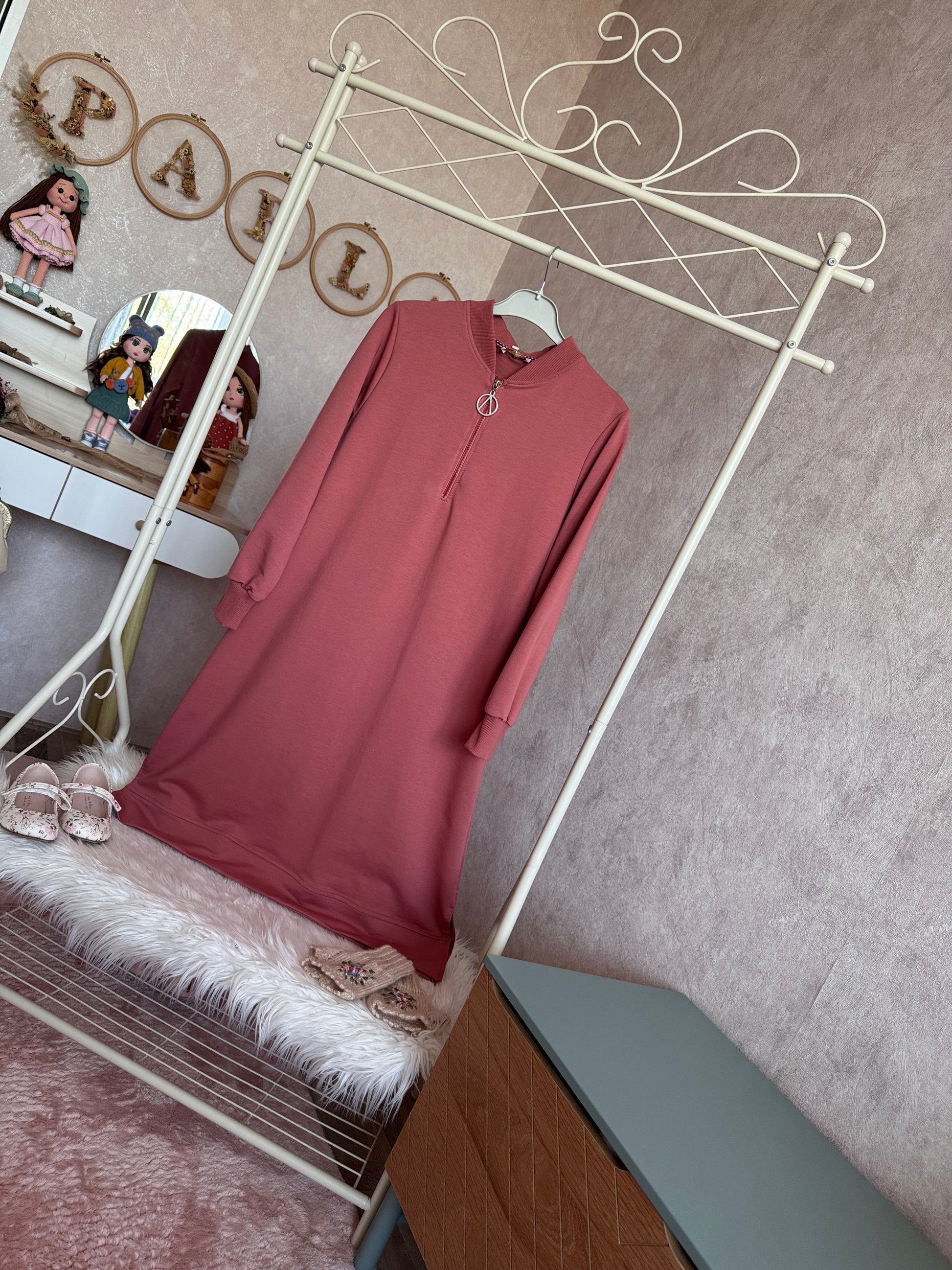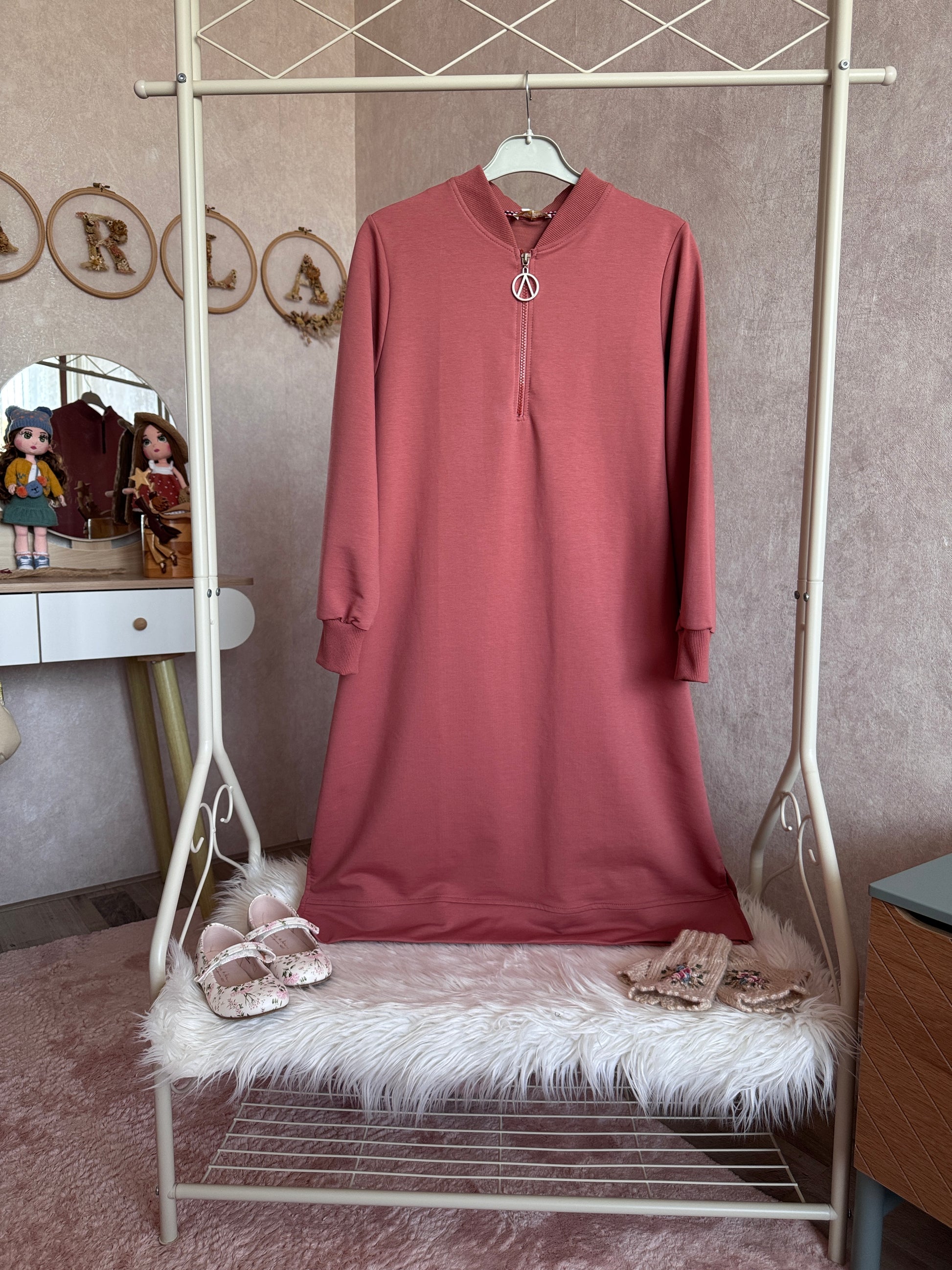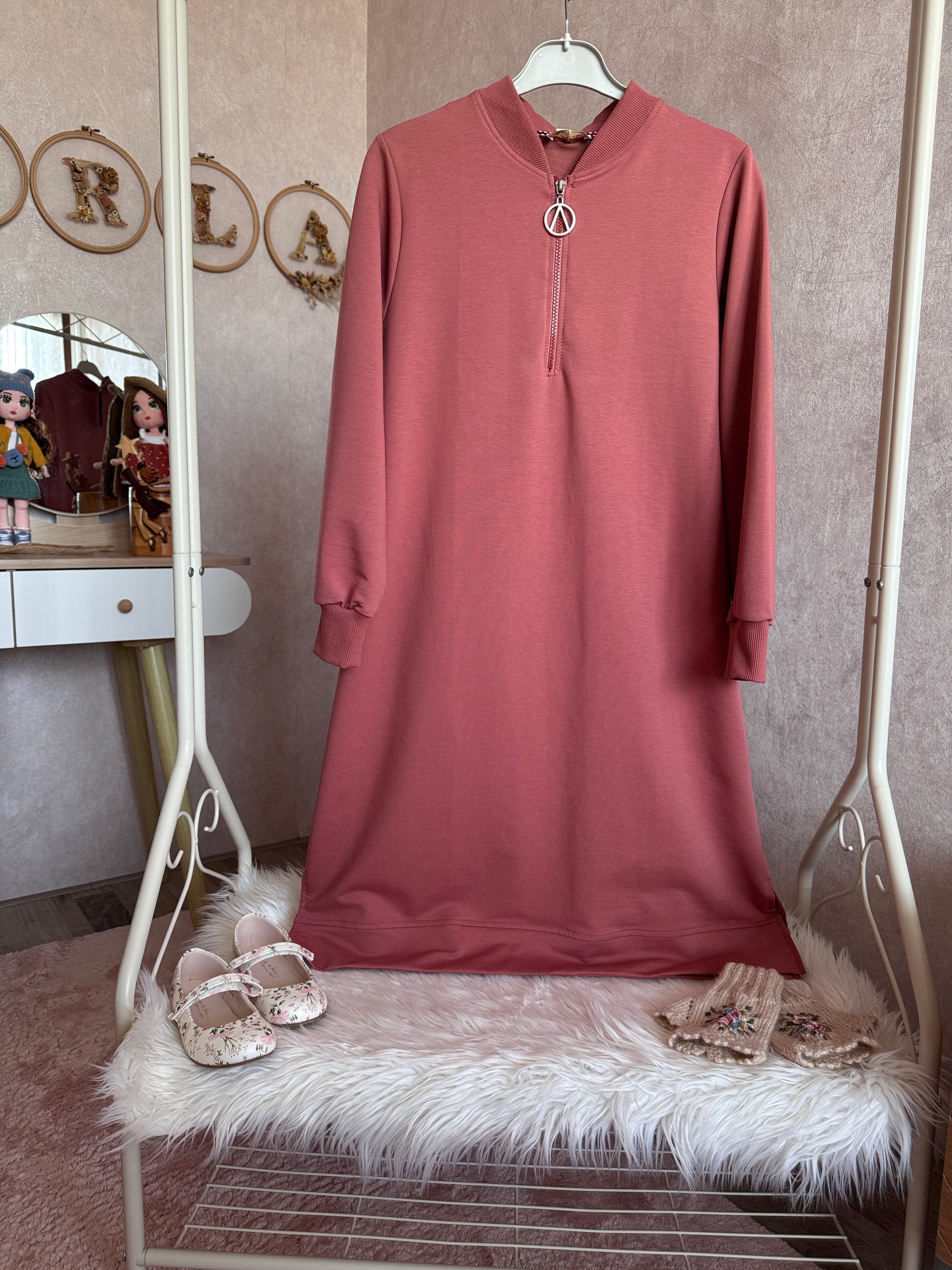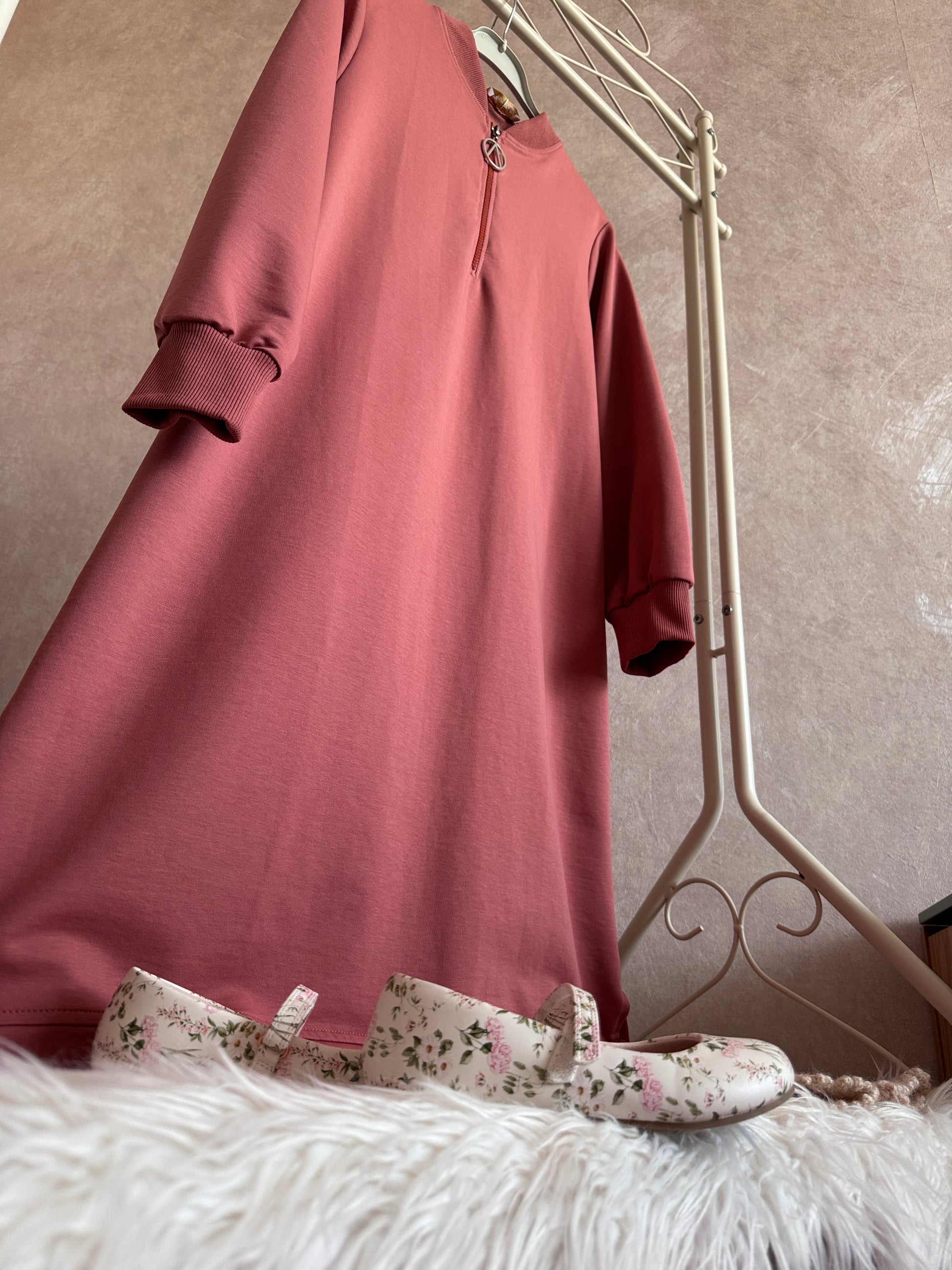 Yakası fermuarlı iki iplik tunik pudra gül kurusu