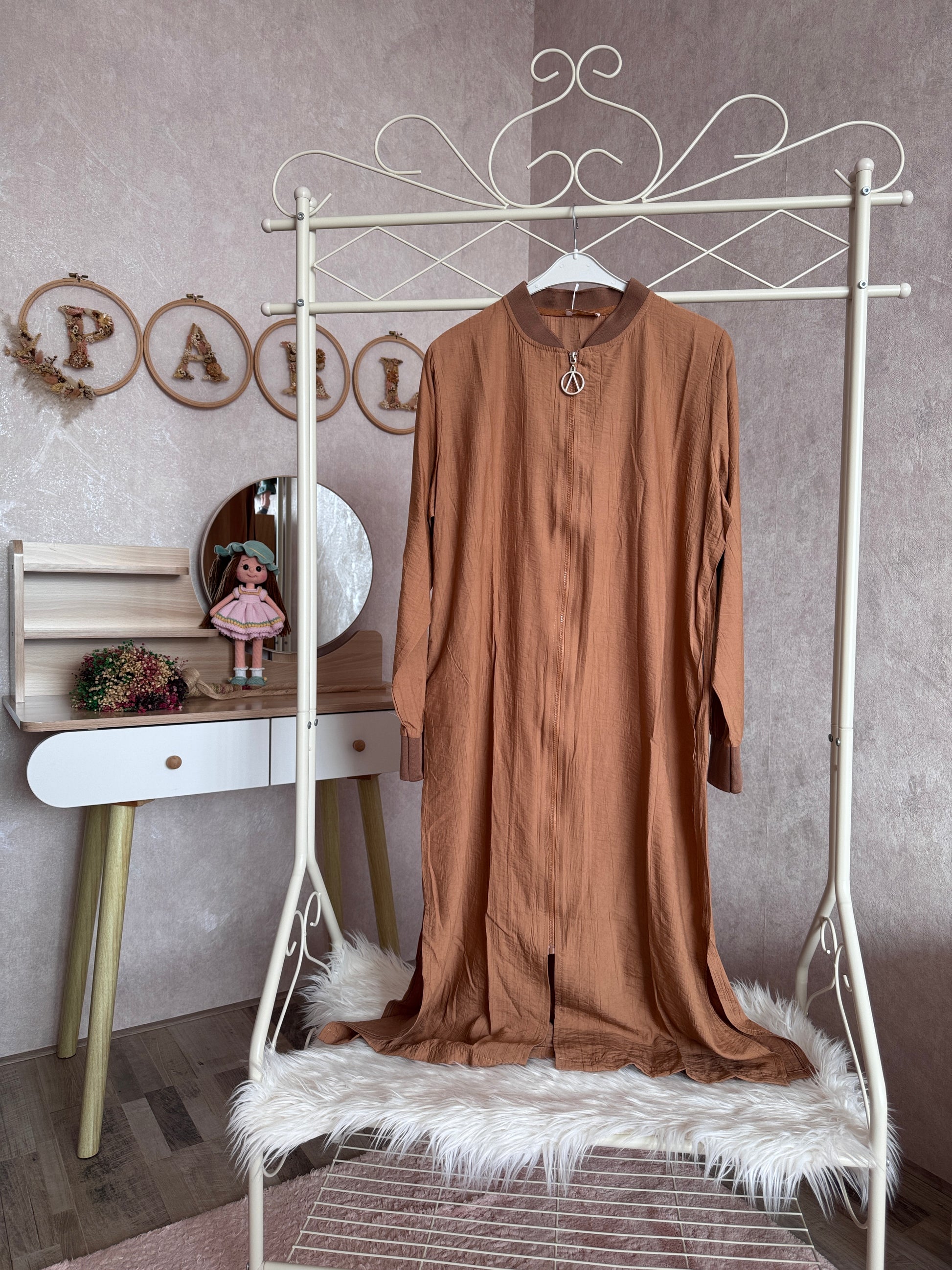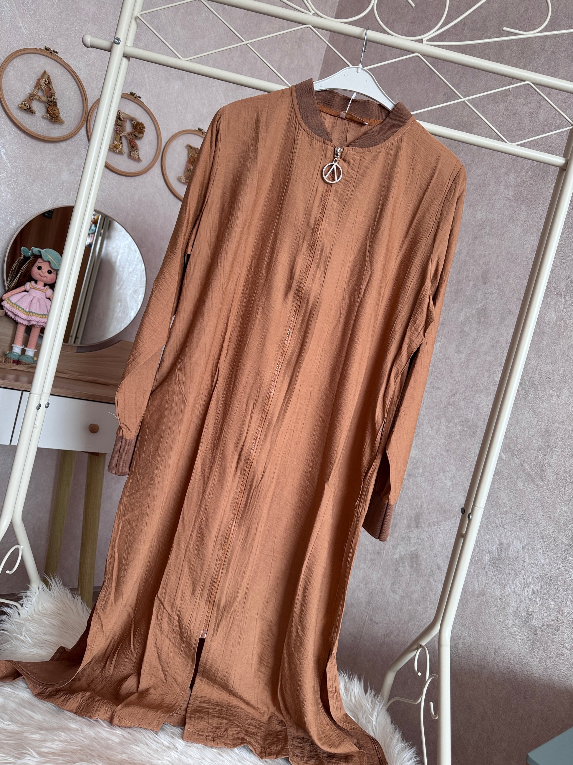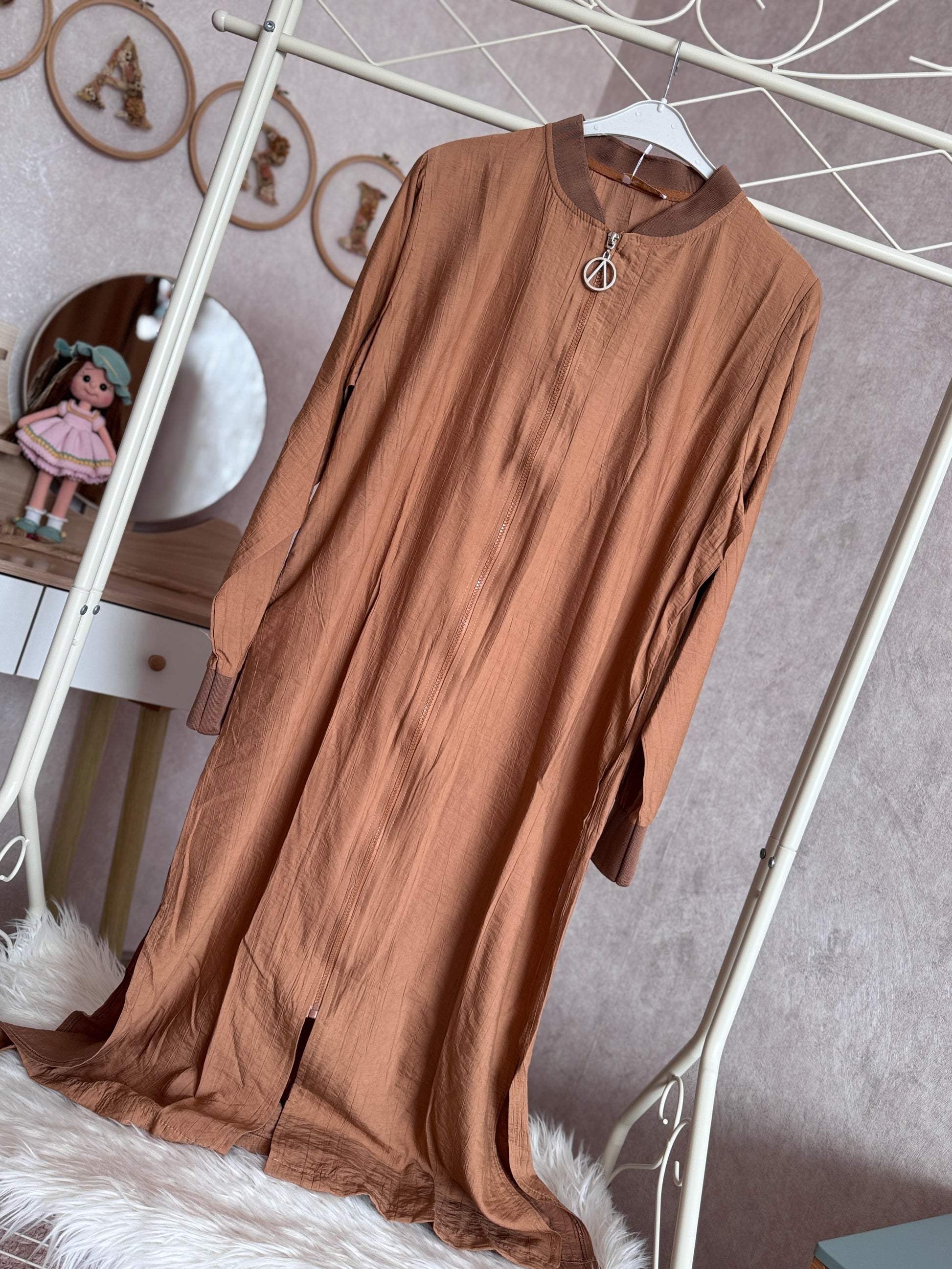 💙Önden boydan fermuarlı yazlık çilek kumaş giy-çık kap modeli, kahverengi